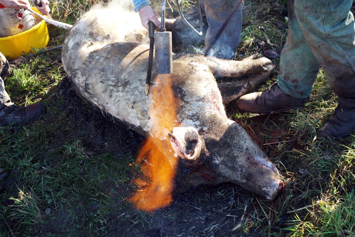 1 Published January 5, 2015 at 1500 × 1000 The skin of the first of three pigs is singed. This process is called “perzselés.” The skin is burnt off with a torch.