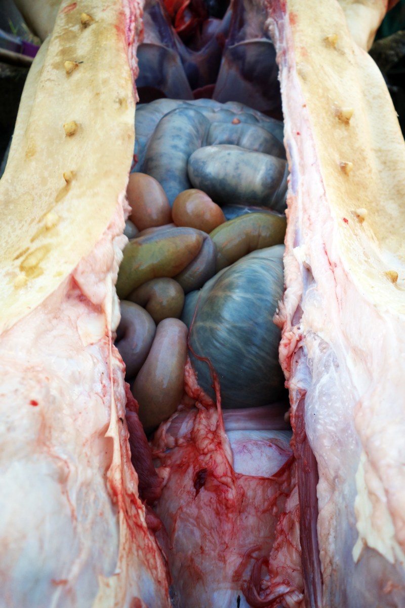 18 Published January 5, 2015 at 1500 × 2250 As the chest of the animal is sliced in half, the organs appear. They are neatly packaged into the two different cavities of the pig. As they are still warm, steam rises off them into the cold winter air.