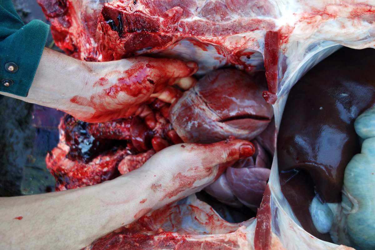 19 Published January 5, 2015 at 1500 × 1000 Joci removes the heart from the chest cavity of the pig. His hands are covered in blood. I ask him what that feels like and he tells me it’s warm, sticky and clean.