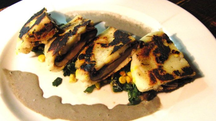A delicious corn arepa made with sweet roasted corn and anise seeds with wild mushrooms, sweet corn, sauteed spinach, huitlacoche cream and roasted cubanelle pepper sauce.