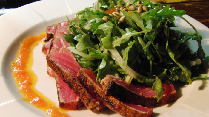 The adobo-rubbed, slightly seared but rare yellowfin tuna was incredibly flavorful and fresh. The fish was obviously very high quality and melted in my mouth, leaving a fresh, clean taste paired with the smokey depth of flavor provided by the adobo-rub crust. The sashimi-shape tuna slices was served with an arugula salad detailed with a bright sun-dried tomato vinaigrette. This dish came pretty close to perfection.