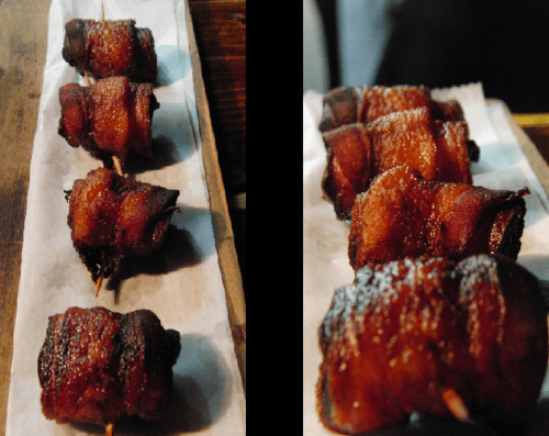 These were perfectly sinful little appetizers. Crispy, fatty bacon wrapped around a gooey, sweet date stuffed with a crunchy, fresh almond. The mixing of the flavors of these ingredients will produce an almost painfully delicious harmony in your mouth and make it pretty difficult to share them.