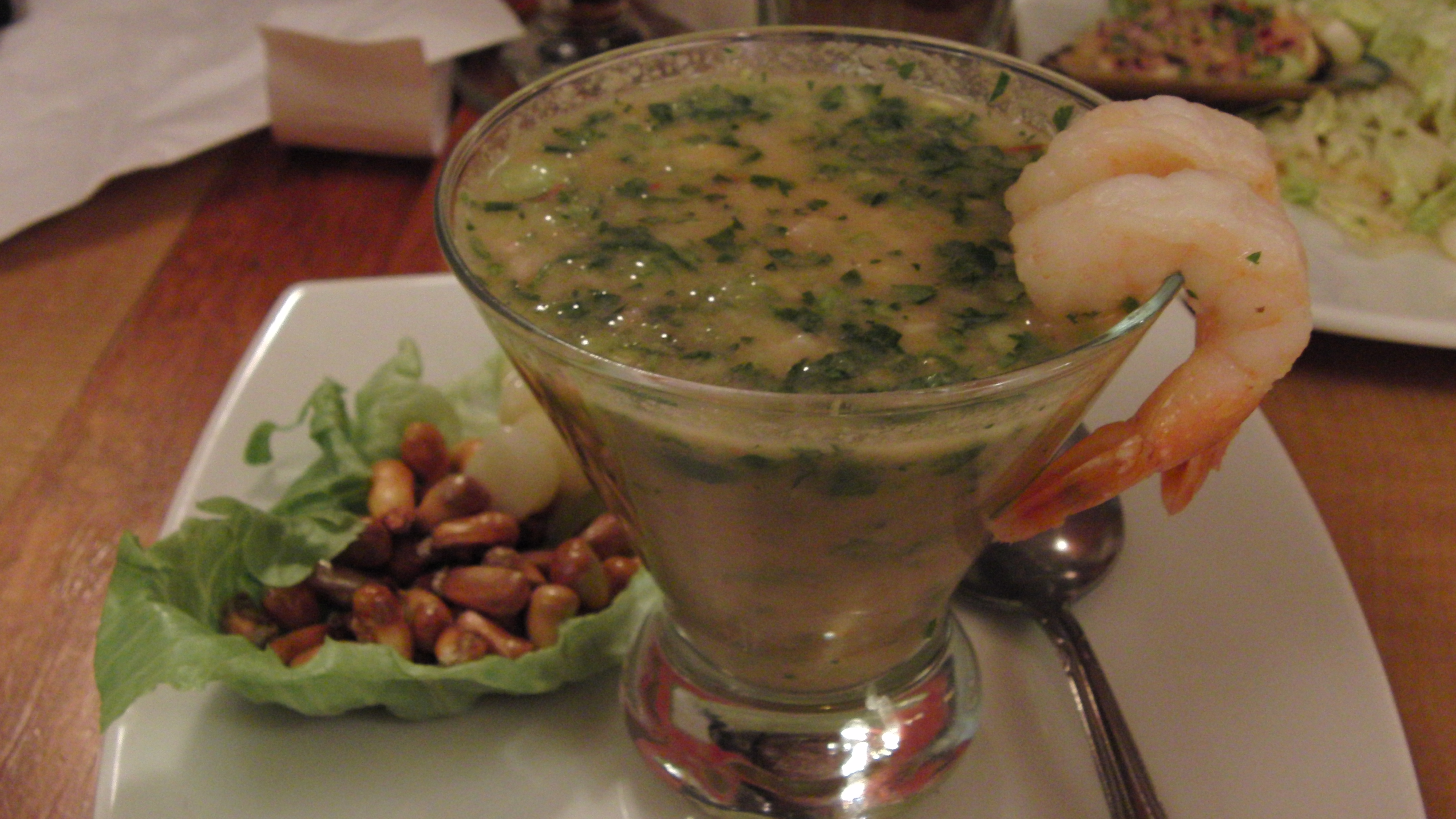 Leche de Tigre is the cilantro-citrus based marinade in which raw fish is traditionally “cooked” during ceviche preparation, either spooned as a soup or (if you’re like me) slurped down like a spicy-sour shot. The one at Rincon Limeno is delicious. The hot-sour combination of lime juice, onion, chiles and fish juice provides a tantalizing, crazy flavor wake up your taste buds, preparing them for the rest of the meal. Also good at curing debilitating hang-overs….