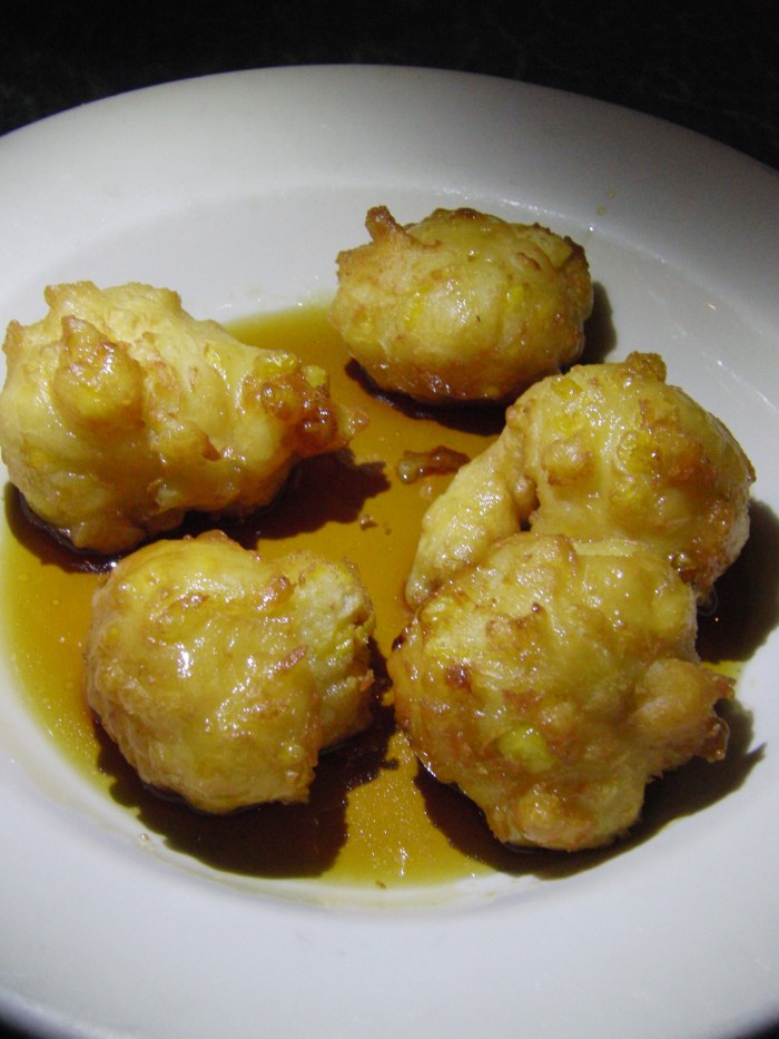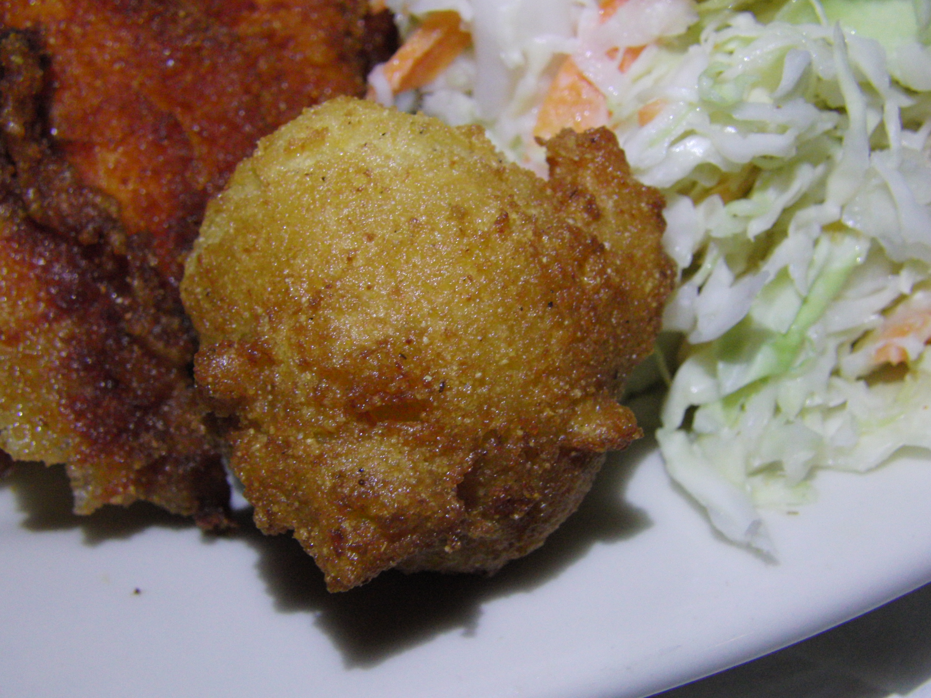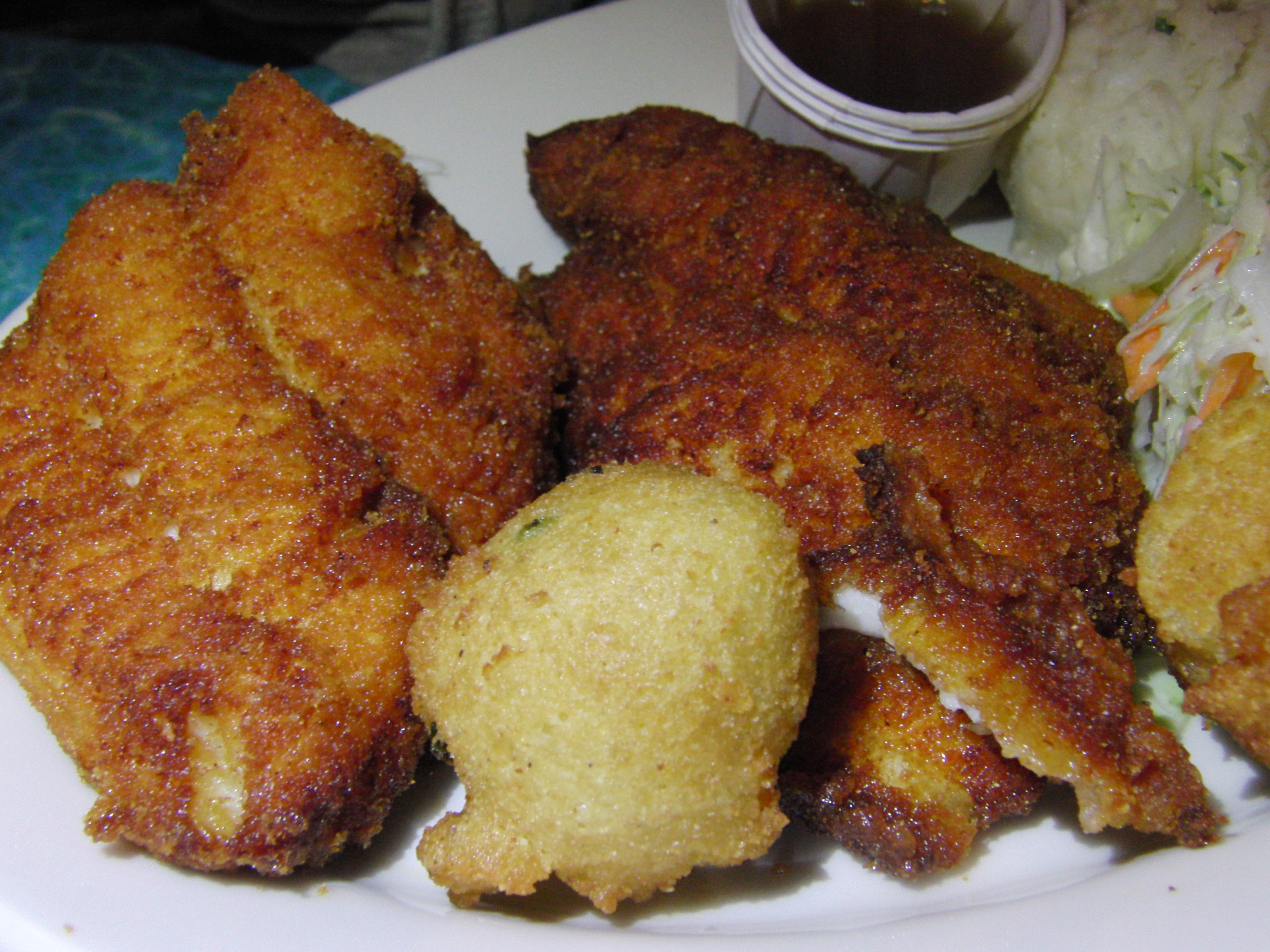 From the one bite of I had of this dish, I could tell that the fish was flaky and fresh, although a bit bland, despite the pepper sauce it had apparently been marinated in. The batter was fried very nicely, not too oily, although the cornmeal made it a bit grainy and dry.