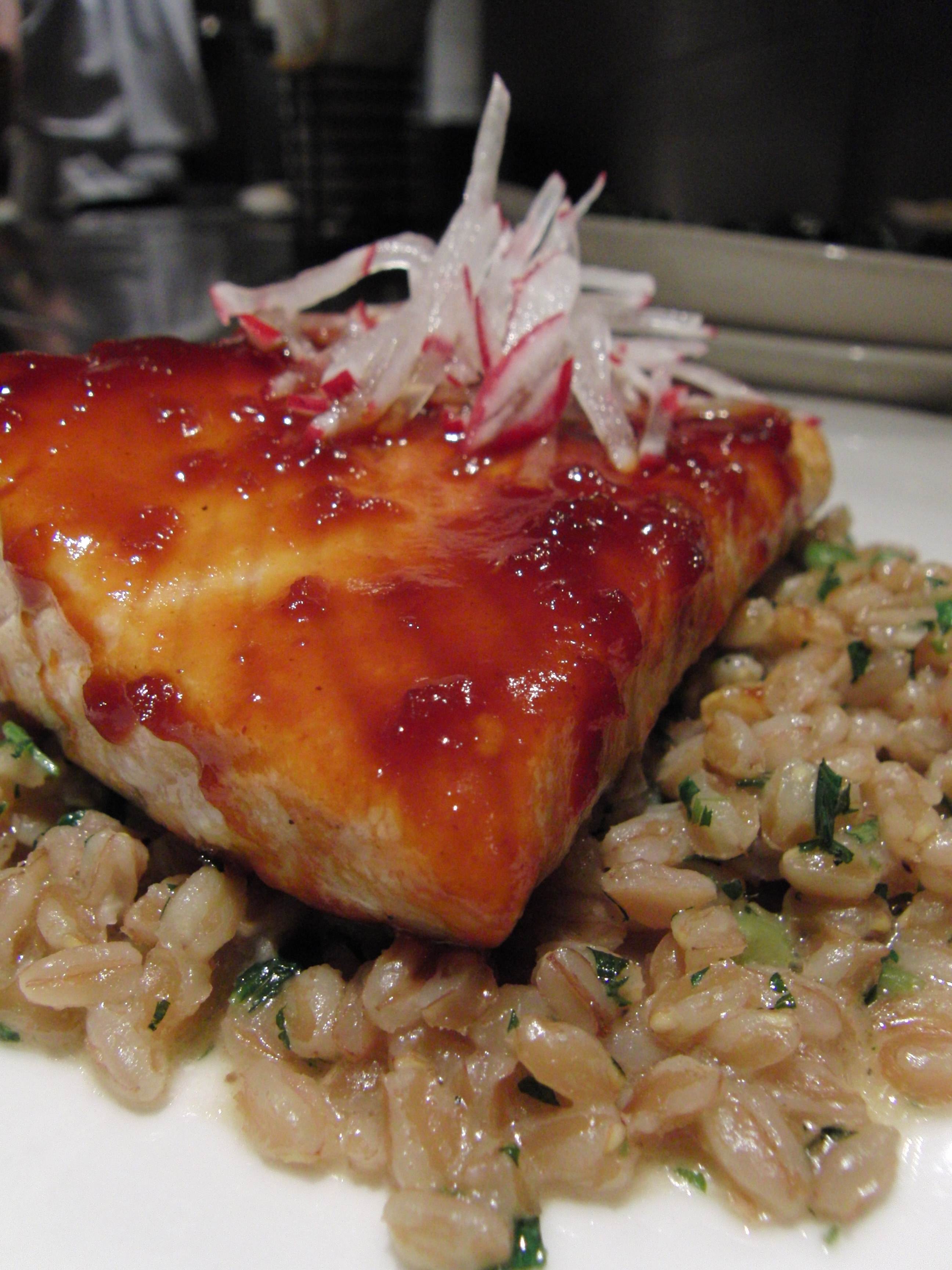 Barbecued Atlantic salmon fillet on English peas, radishes and farro Published September 21, 2011 at 2592 × 3456 in Kitchen Photography at Sel de la Terre (Long Wharf) ← Previous Next → Barbecued Atlantic salmon fillet on English peas, radishes and farro