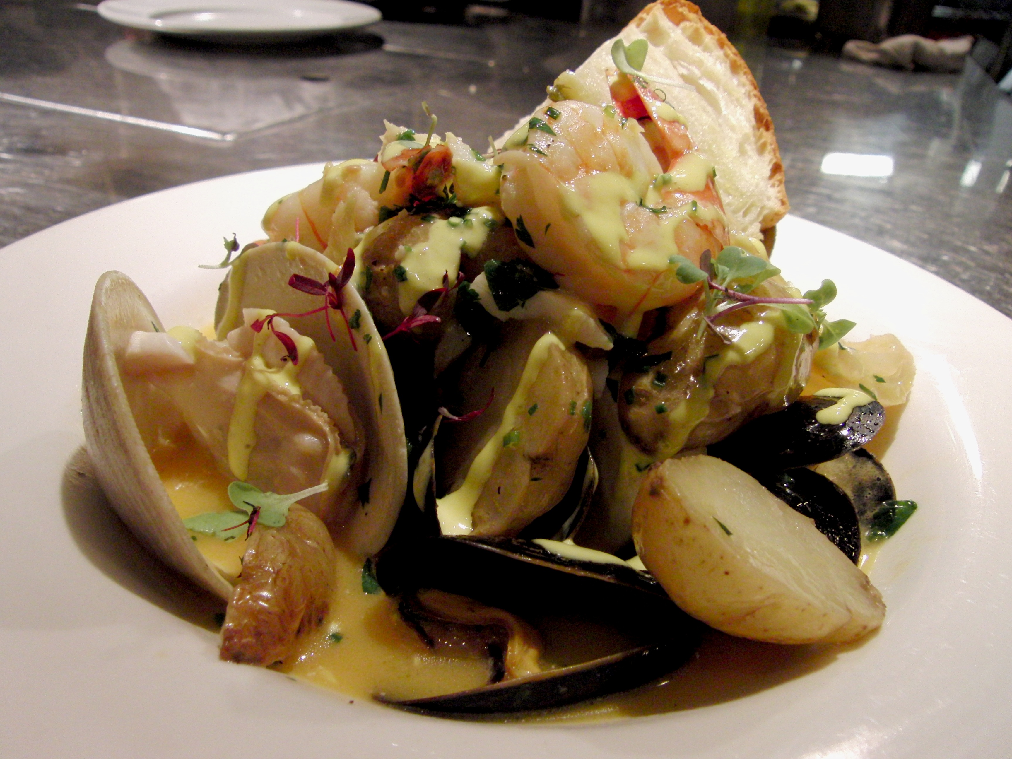New England bouillabaisse Local cod, Wellfleet littleneck clams, Blue Hill Bay mussels, Blue prawns, fennel, potato, and saffron rouille Published September 21, 2011 at 3456 × 2592 in Kitchen Photography at Sel de la Terre (Long Wharf) ← Previous Next → New England bouillabaisse Local cod, Wellfleet littleneck clams, Blue Hill Bay mussels, Blue prawns, fennel, potato, and saffron rouille
