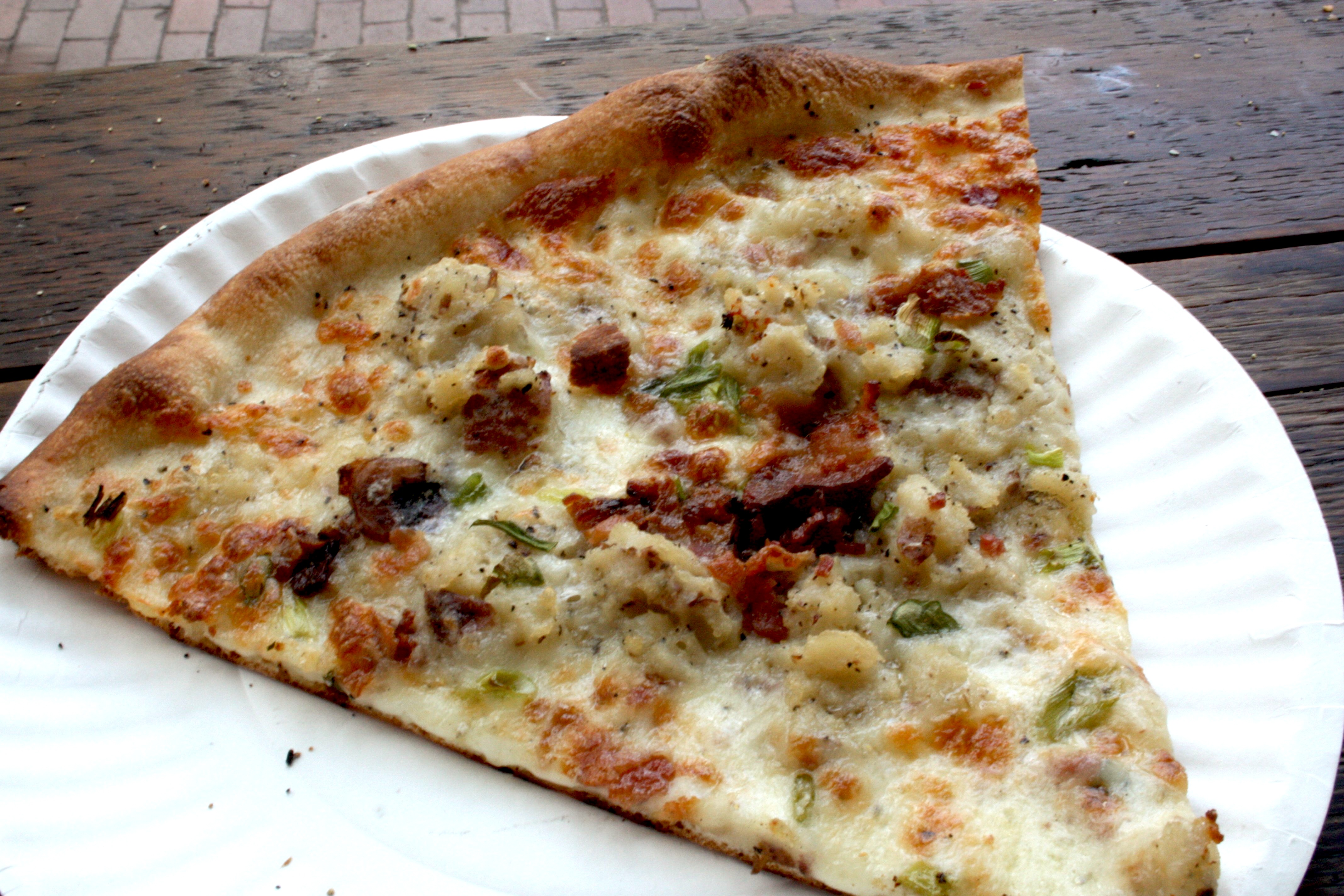 A fantastic combination of flavors and textures. The crispy, salty, warm bacon counteracts the cool, tart freshness of the thin apple slices scattered over the pizza. The slivers of grilled red onion add a soft, sweet familiarity and comfort to each bite. The patches of tomato sauce, blending with the bits of velvety melted cheese are just enough to add another layer of flavor and nice, mushy texture while not in any way overpowering the three key ingredients. The crust is crispy and thin, yet holds up the toppings without getting soggy. A great complexity of flavors.