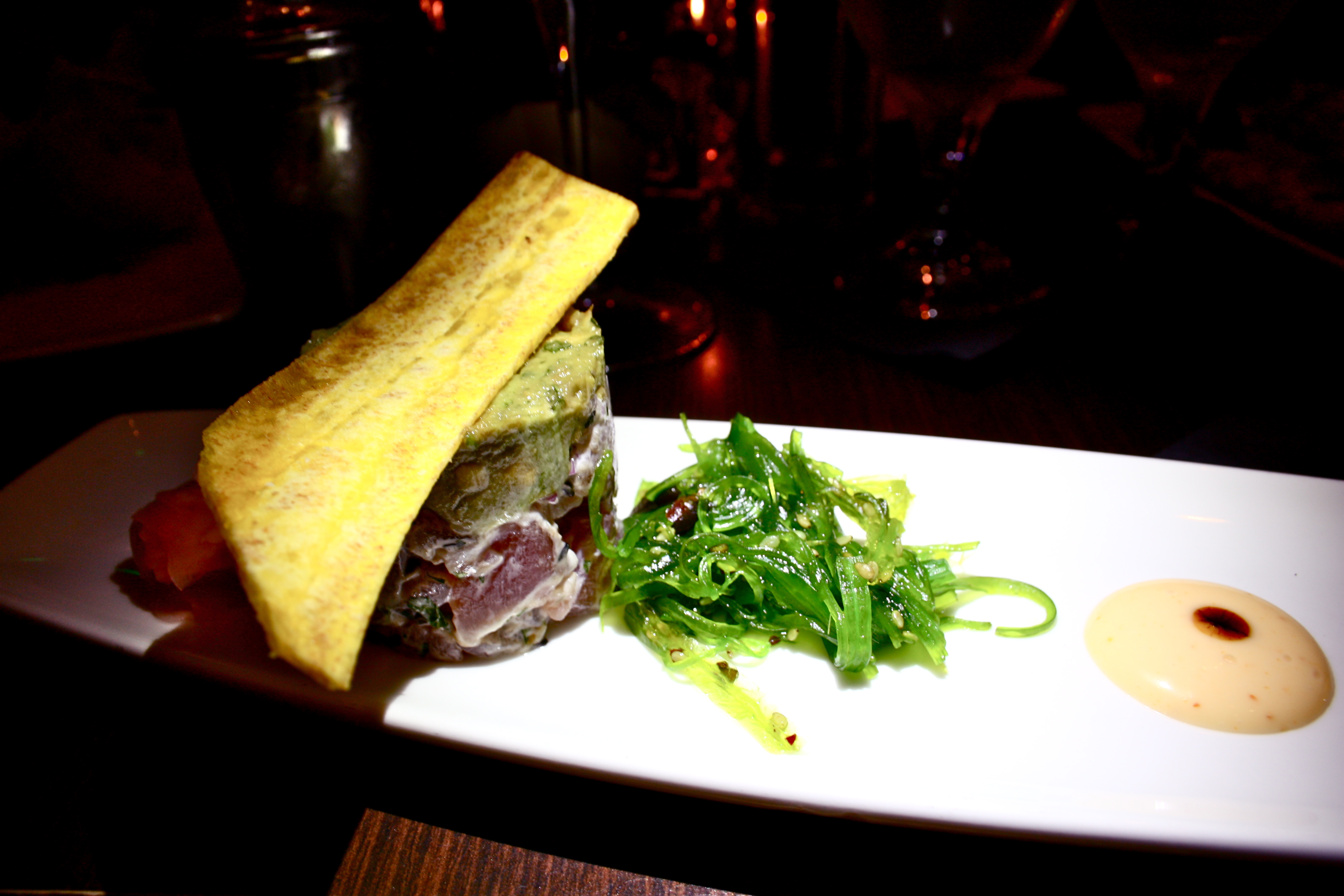 This tuna tartar was a fantastically unique Latin American take on a class dish (unlike Mare’s version, see below). The fish itself was cut into larger chunks than is traditional, which allowed the tender tuna flesh to completely engulf your palate in its clean flavor and moist yet firm texture. Bits of cilantro and lemon complemented the fish well and pulled it into a South American direction, as did the layer of very ripe, mushy avocado which capped off the tartar tower. To add the contrast which crunchy, toasted baguette usually provides in the classic French version of the dish, a think, crisp sliver of savory plantain lay on top of the tower, ready to be used as a fork to scoop up the fish with. A garnish of seaweed salad and a small pool of spicy mayo added a great Japanese hint to this otherwise Latin American tuna tartar, bringing out the versatility of the fish while in no way clashing with the other ingredients.