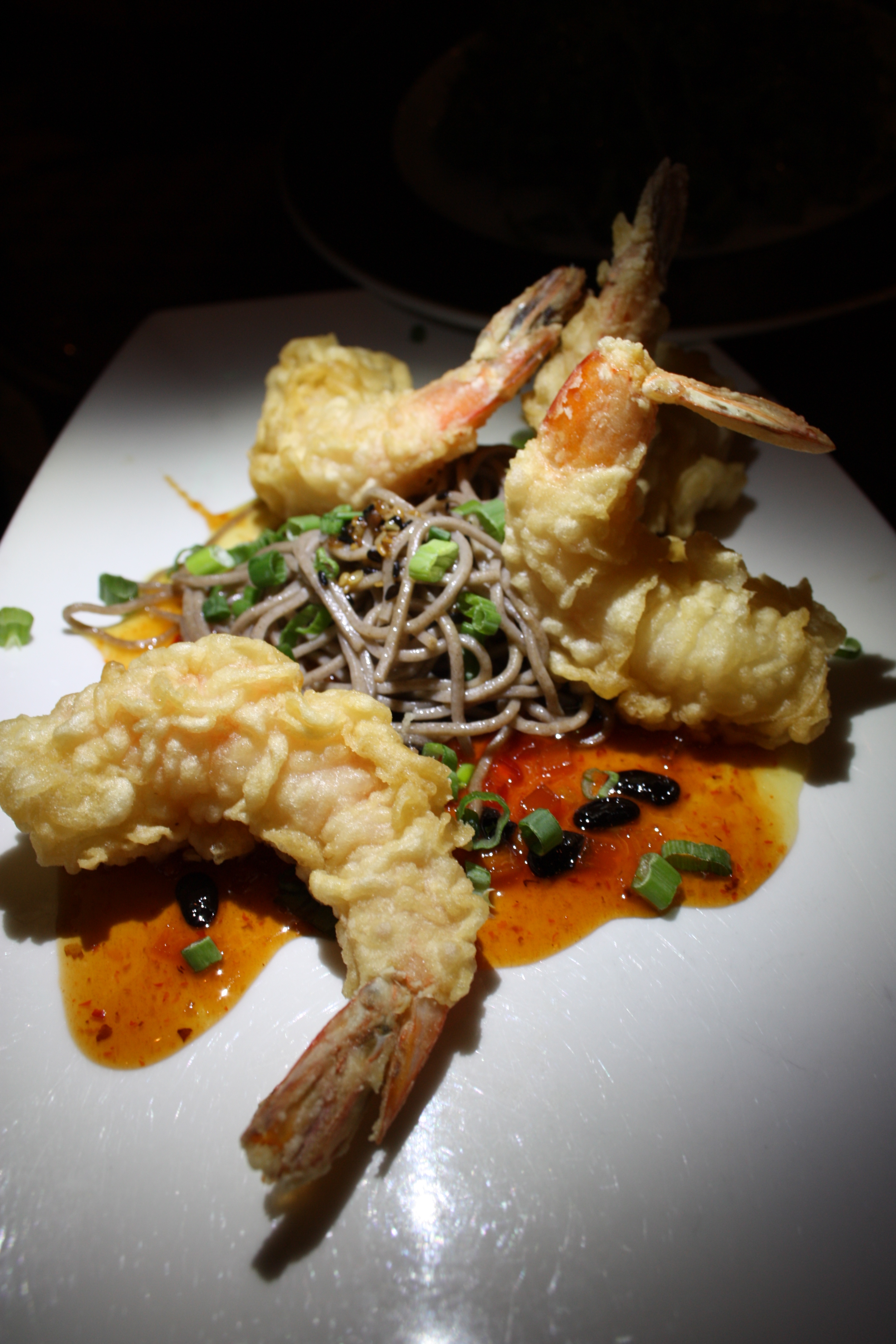 Crunchy, plump, perfectly cooked shrimp wrapped in a crisp, golden-fried, not too greasy, not too moist tempura coating. The pineapple went wonderfully with the flavor of the shrimp, giving it a tropical island twang and the black bean sauce gave it a great depth of flavor. The purple udon-like, earthy buckwheat (?) noodles provided contrast of both texture and flavor, making this a very complex and fun dish.