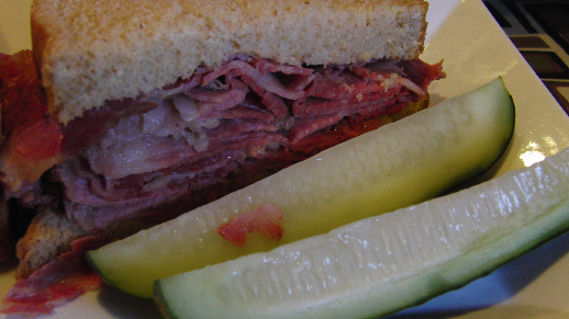 Any cocky New Yorker claiming that there is not a single good deli in Boston is wrong. Yeah, yeah yeah, lots of Jews in Brookline. However, there really is only one good deli and it’s not the overpriced, fancy-fied Zaftigs, but Rubin’s down the street. A simple and frumpy place for sure but their meat cuts are incredibly good and daily fresh, their knishes perfectly baked and flavorful and their pickles are the real deal. This is my personal favorite sandwich to get here. I don’t really like rye bread so I got it on wheat (I know, I know it’s sacrilegious but whatever). It is very hard to accurately describe just how incredibly moist and tender this corned beef was. The smokey, salty flavor of the meat capped with just the right amount of silky fat made this sandwich juicy and satisfying. There was no firm texture contrast within this sandwich, each bite represented a homogenous, delicate pillow of a mouthful but this was one of those times where contrast was just not necessary. However, outside of the ‘wich, there was a crisp pickled cucumber to wake up the taste buds and offer some textural contrast within the dish and this was greatly appreciated, as was the spicy hot mustard (Russian writing on the label, always a good sign) that came on the side.