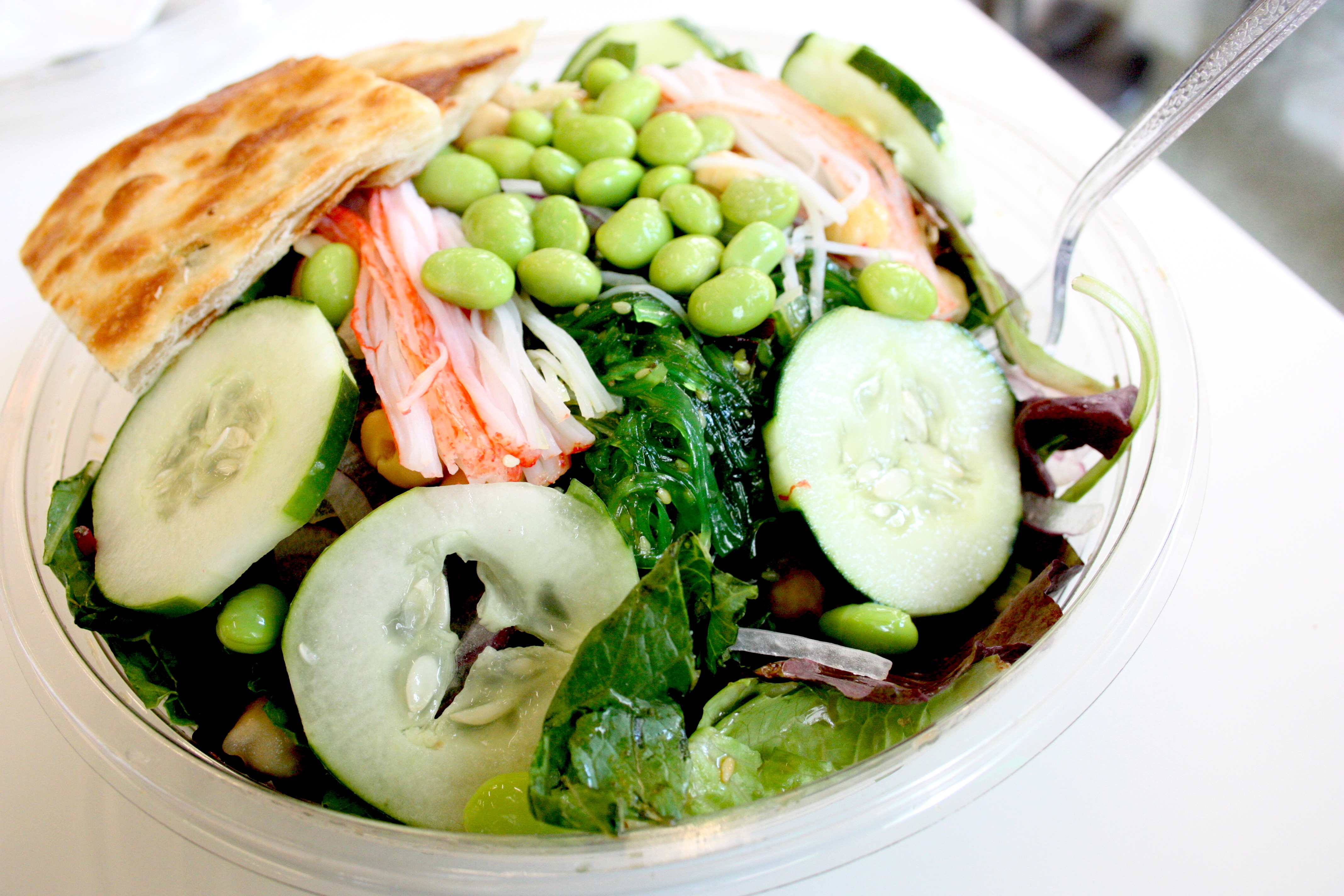 This summer Foumami became my favorite place to grab lunch in the Financial District and I owe it all to this wonderful salad. Romaine lettuce tossed in a tangy, delicious soy and chili vinaigrette topped off with a generous amount crisp, slightly oily, briny and nutty green seaweed, fresh and sweet sliced crab meat, creamy, nutty chickpeas, crunchy, bright green edamame, rounds of kirby cucumbers and slivers of red onion going through. I recommend mixing everything together so that each mouthful contains every ingredient as they harmonize together perfectly. The green flavors of the edamame go beautifully with the deep, smokey flavor of the soy-chile vinaigrette and the salty marine tones of the seaweed. Chewy, slightly oily but still very light scallion pancakes come with the salad, soaking up the moisture and adding yet another texture to the dish.