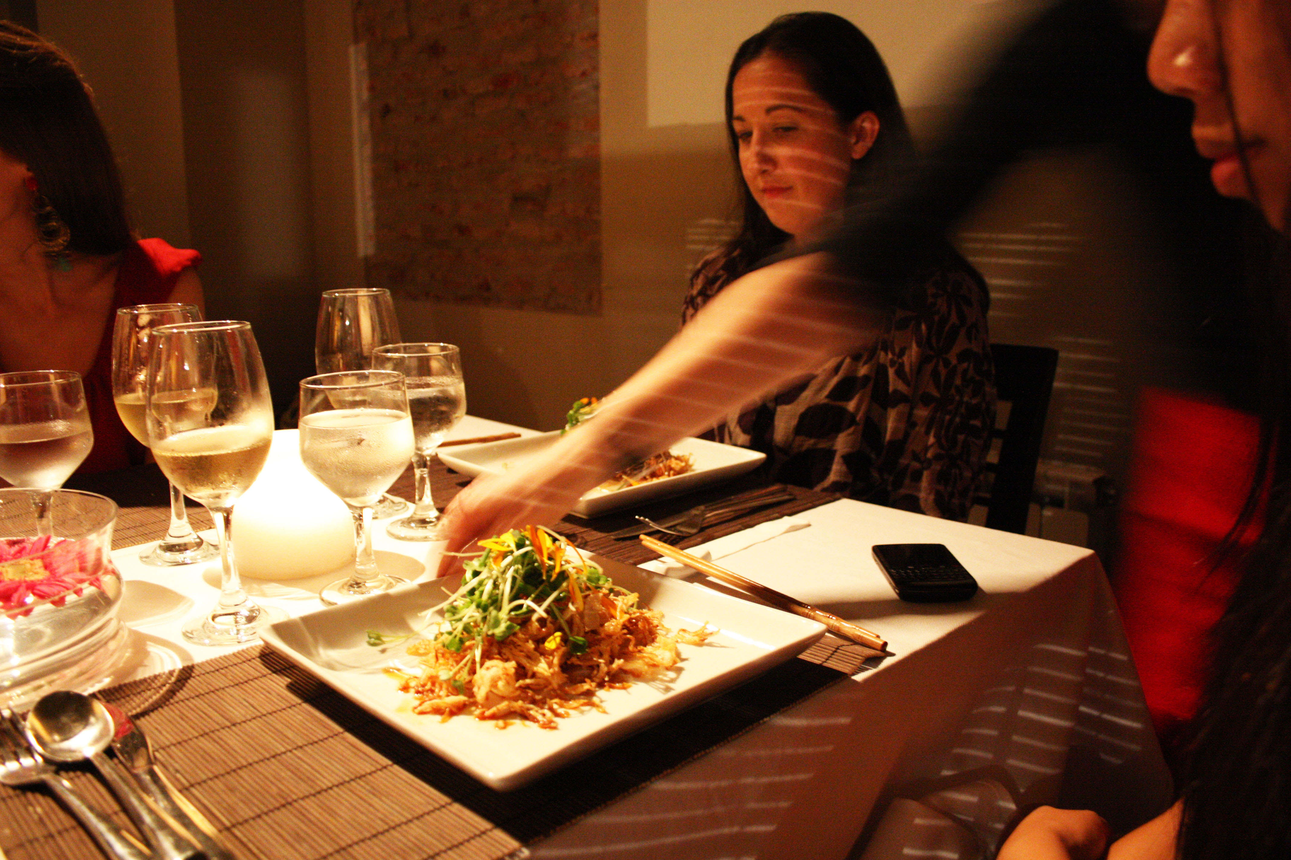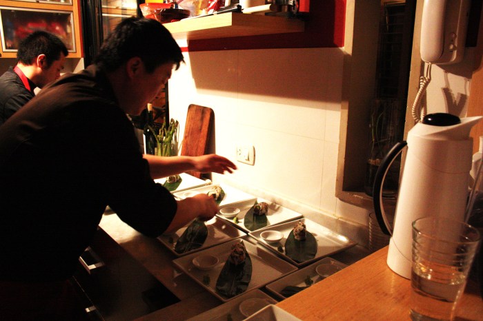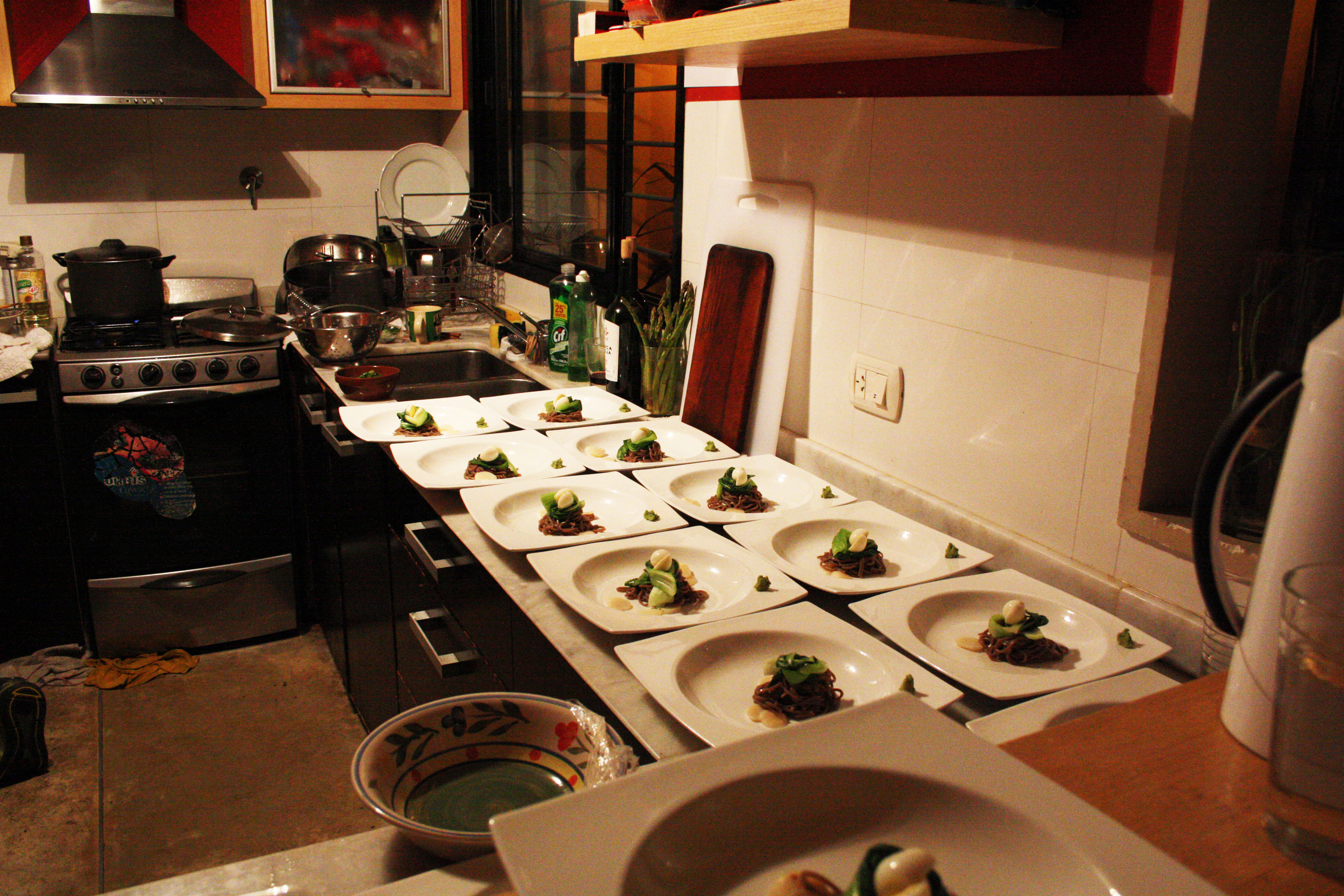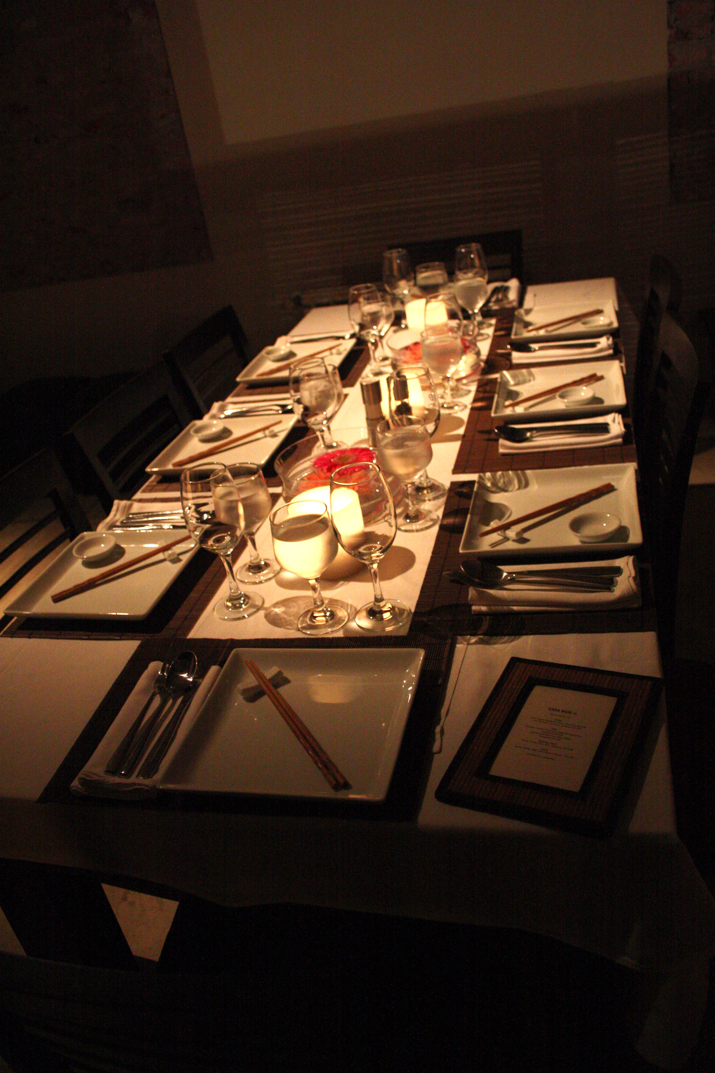 Making a reservation at Casa Mun is surrendering yourself to Chef Mun’s world, becoming friends with him on facebook, entering his home, meeting his dogs. The night started out with a champagne reception, my friend and I and 12 other lucky guests gathering and mingling in the hall of the chef’s Palermo/Villa Crespo loft, the ground floor of which has been converted into a elegantly decorated, softly lit dining room. As we got to know our soon to be companions through the upcoming gastronomic journey, as well as the very sweet San Franciscan lady who would help serve our meals and generally take care of us through it, the Chef and his able sous were already busy in the kitchen putting together the finishing touches of the first course. I took a peak into the kitchen to introduce myself to Chef Mun and was greeted with patient kindness and hospitality, despite the lively hustle-and-bustle of the food-prep.