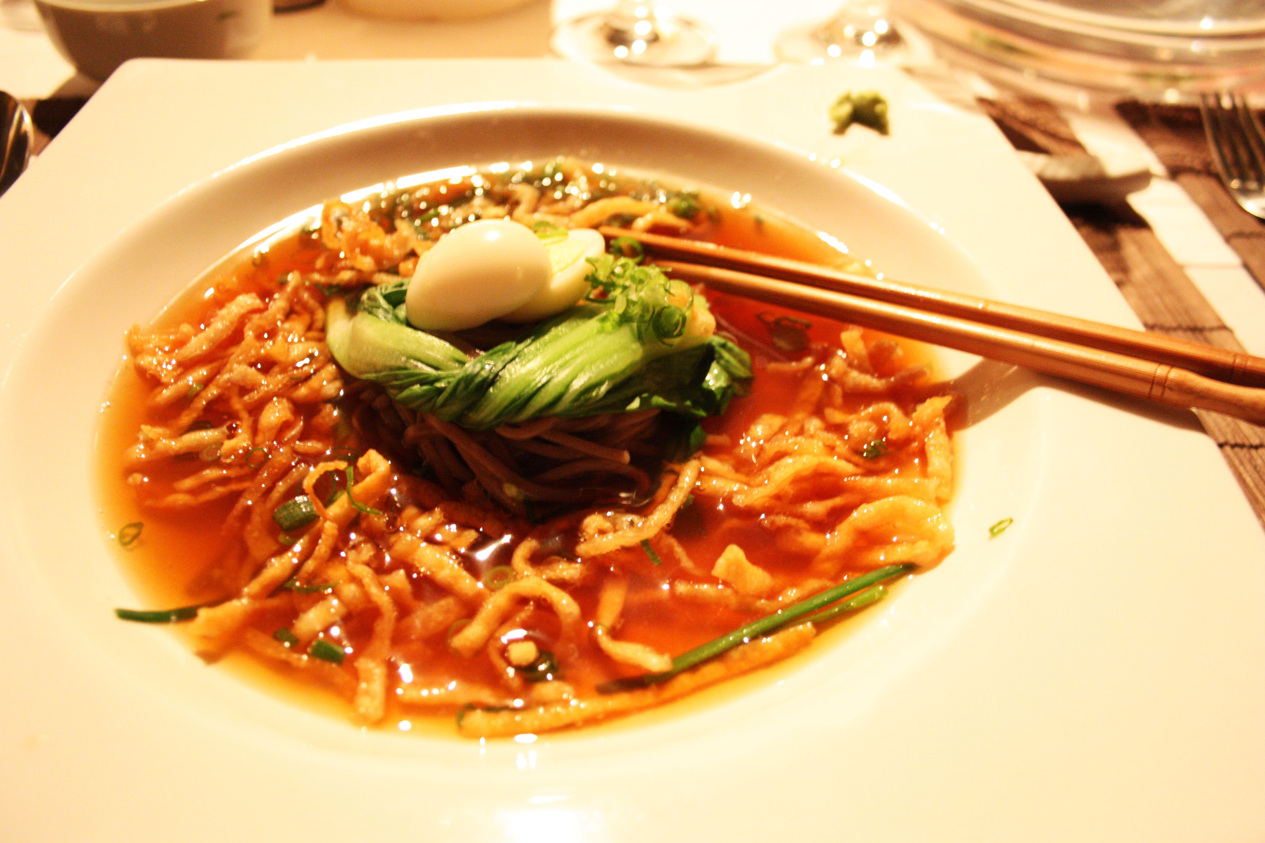 Japanese Soba Noodle Soup: A wonderful start to our 5-course meal. The buckwheat-flour based soba noodles had a perfect soup-noodle texture, soft yet firm, slick and slightly chewy. They contrasted beautifully with the fried golden wonton noodles sprinkled over the top, which gave an exciting crunch to each bite. The shiitaki-mushroom and soy infused broth, to me, was an absolute masterpiece, visually striking in its clear transparency and beautiful red-orange hue, with a deep, earthy-sweet flavor which was woken up suddenly when mixing in some of the prickly wasabi on the side of the plate. The bok-choy gave a fun, slippery yet crunchy-when-bitten-into texture while the halved quail egg balancing on the top provided an intense creaminess with its velvet gold yolk. The bits of water chestnut swimming in the soup gave a crisp freshness that harmonized with the bok choy and contrasted nicely with the rest of the ingredients.