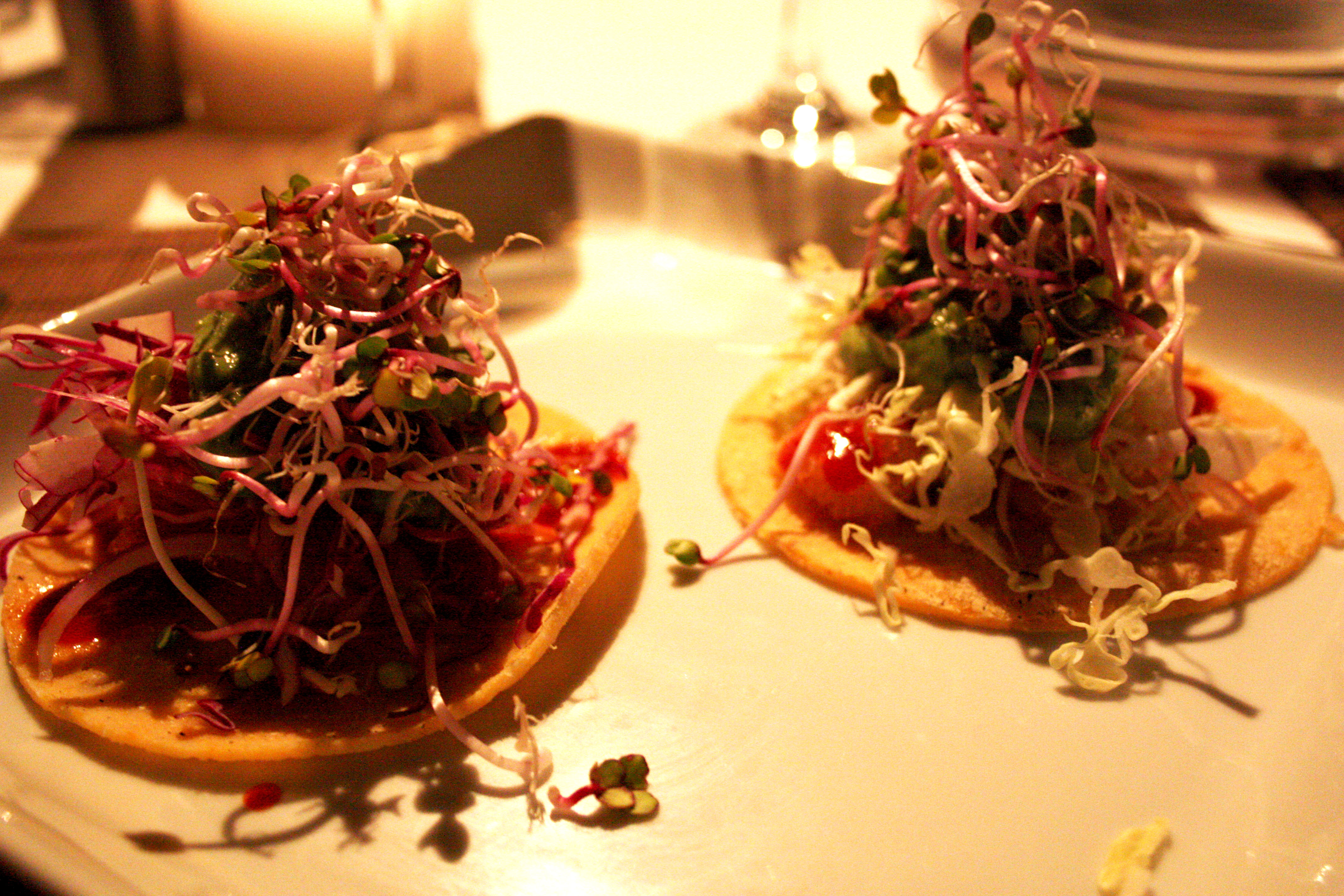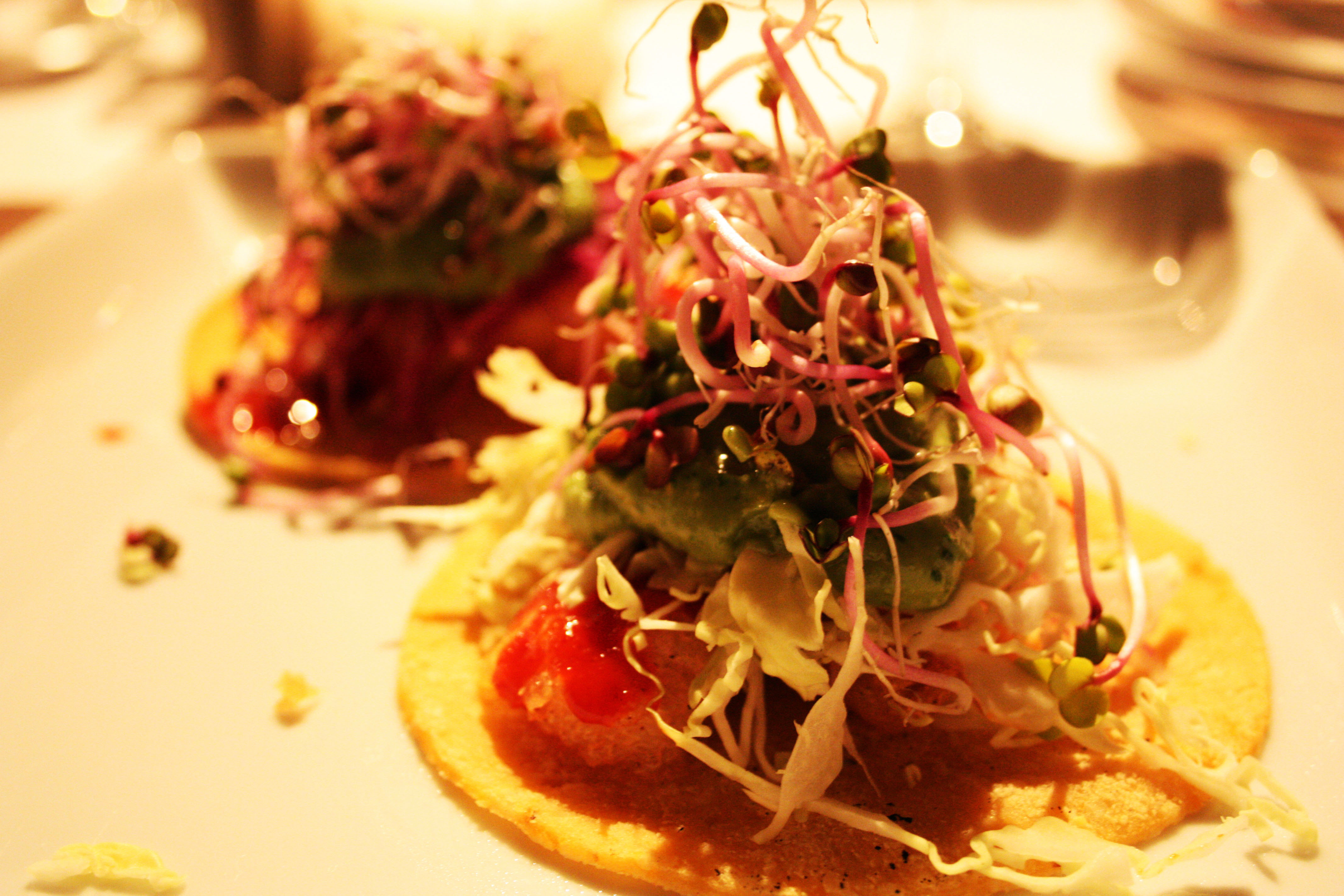 Fiery Fish Tacos: Chunks of Korean-style-BBQed fish drizzled with a bit of spicy, chile-flavored gochujang sauce and doused with sickly sweet and cool cilantro relish. Topped off with crispy, fresh julienned cabbage and a bit of hot jalapeno wasabi guacamole which communicated and harmonized with the cilantro relish across the bed of cabbage beautifully. All this was held up by thin, slightly-grainy corn tortillas. A very complex dish and definitely the funnest one to eat.