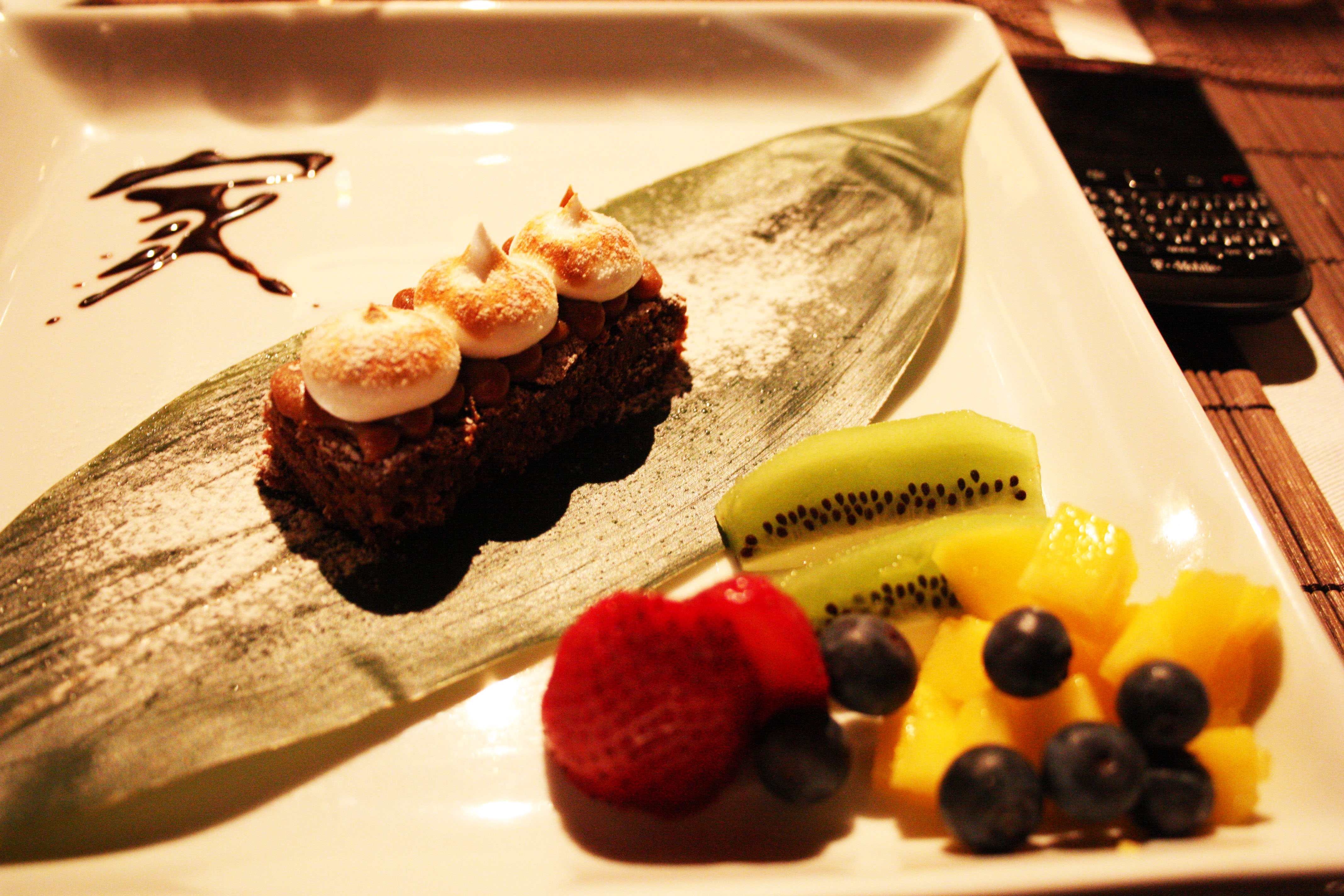 Brownie with Dulce de Leche and Italian Merengue: The final course, dessert, an ode to Argentina. A thick, chewy chocolate brownie smeared with creamy sweet dulce de leche and topped off which 3 little dollops of fluffy on the inside, sticky on the outside Italian merengue. Served with vibrant, tart fresh fruit: a bit of chopped mango, a few strawberry halves, some kiwi and blueberries. Served with a clean green tea.