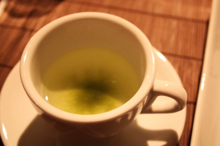 Albacore Sashimi with Crispy Onion: Thin slivers of slightly seared, fresh albacore served sashimi style with a bit of citrusy, tart ponzu sauce over it and a nest of hair-thin crispy fried onion nesting on top. Chives and micro-greens woke up the onions a bit, blended the fried crunch with a green freshness. I treated the fish as a wrapper, curling it around the onions and greens so my tongue would touch the slippery, cool fish first and then the stuff inside. A wonderful blend of textures and flavors.