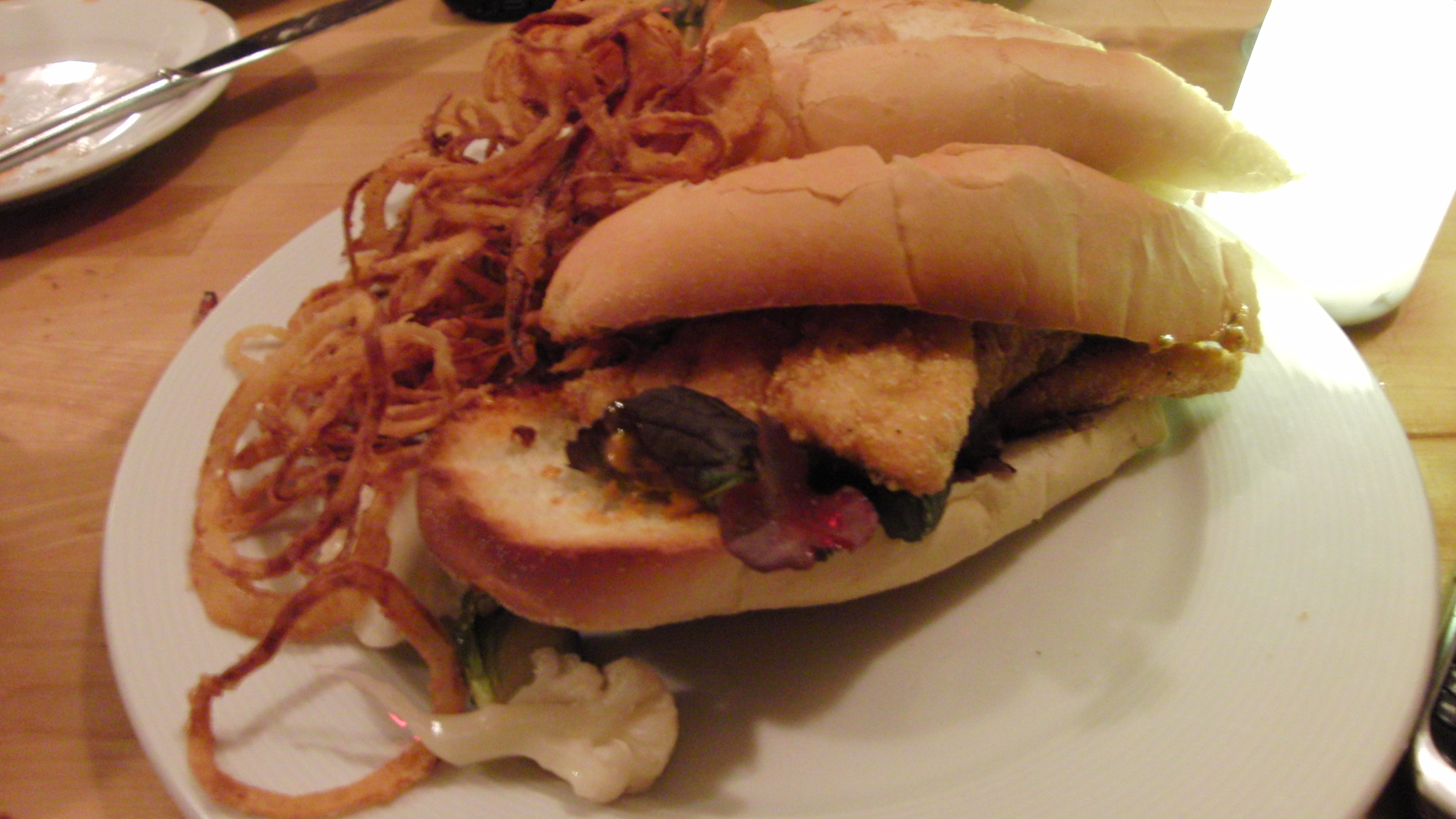 Hungry Mother’s signature dish and I can see why, although it wasn’t perfect. Very nice, fresh catfish lightly fried with a crispy, grainy cornmeal coating, served with spicy and slightly sweet red remoulade sauce between two slices of airy toasted bun. Served with a generous heap of crispy “tobacco onions” (onion strings), lettuce and bits of blanched cauliflower. A very filling and satisfying meal indeed, although the toasted bread and coating on the fish made the sandwich a tiny bit dry for me.