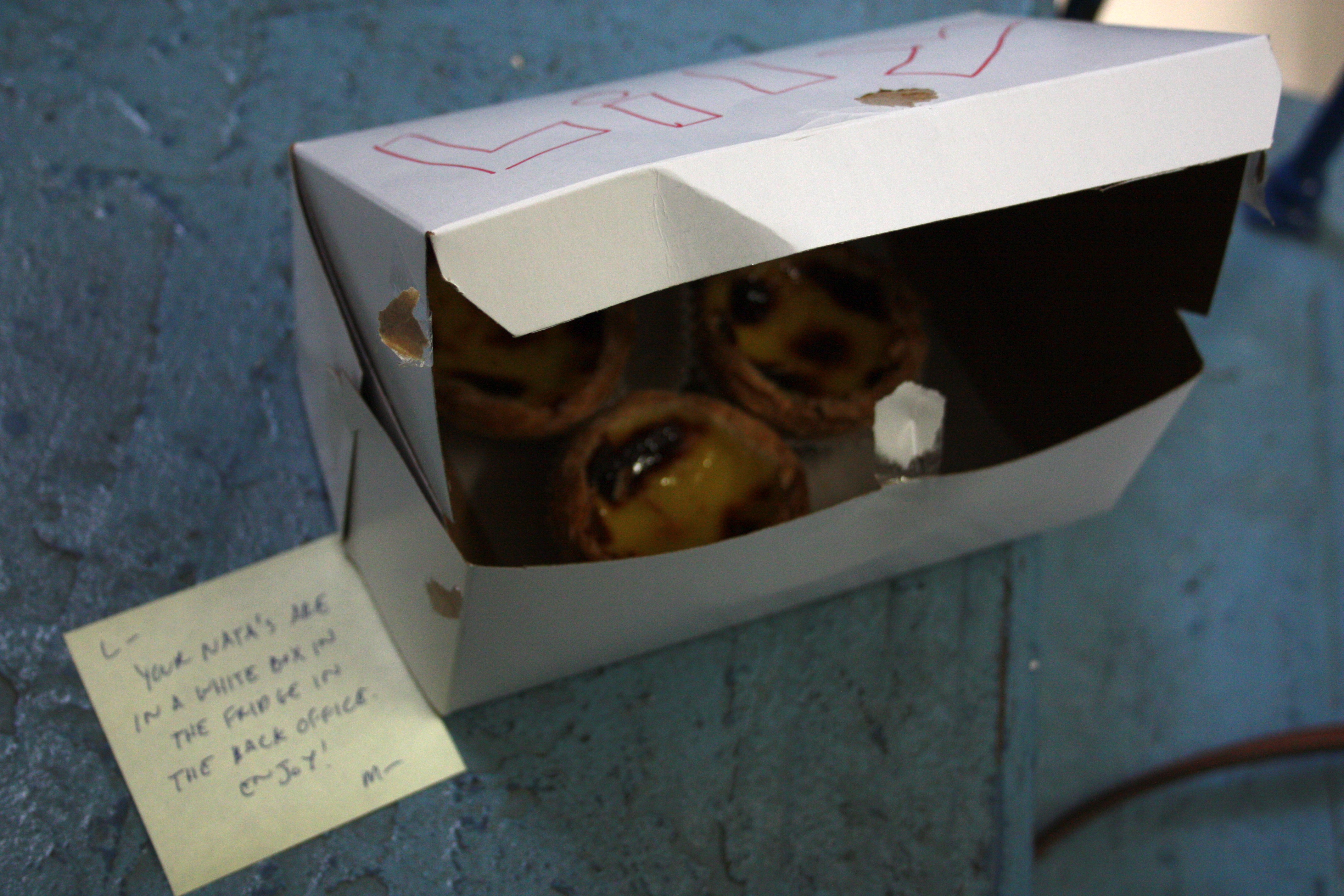 I was thrown back into that beautiful plaza a few days ago while sitting in my cold fluorescent office in Boston. My coworker and buddy Mark brought me these treats from Lydia’s Bakery in New Bedford and as I ate them, though a little rigid from sitting in the refrigerator until lunch-time, the smooth custard and crunchy shell instantly reminded me of that first bite of Lisbon. Deliciously sweet and packed with love, the real deal.