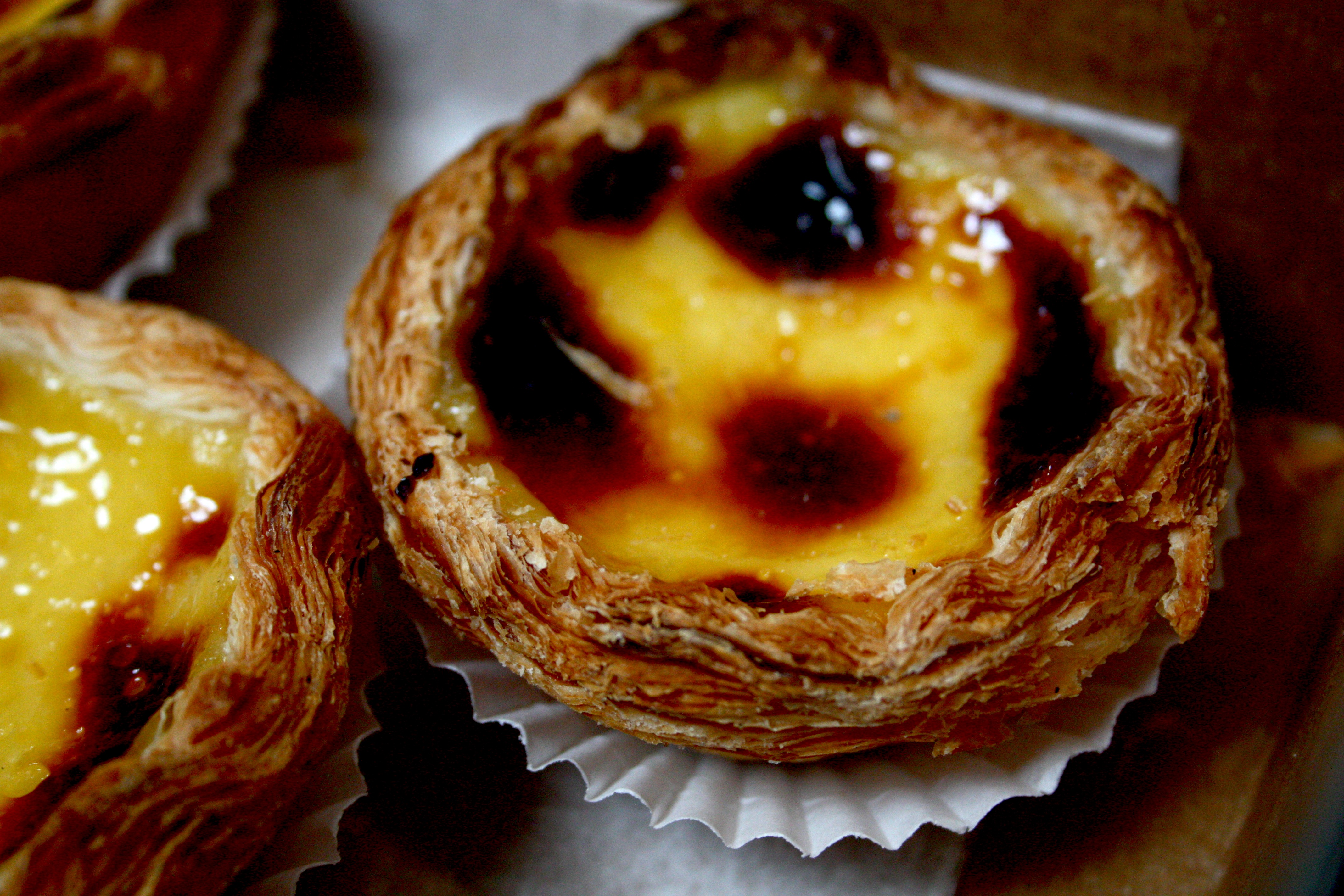 The first time I ever sank my teeth into what was to instantaneously become my favorite sweet pastry was in the summer of 2009 in a cafe in a Chiado plaza in Lisboa on my road-trip with my friend Eszter. Before our first long day of site-seeing we decided to fuel up with a large breakfast and, as we had heard tales of splendor about Portuguese pastries, we decided on a traditional bakery in the main plaza. We each ordered a cappuccino (I ordered an extra shot of espresso) and we picked two pastries to share, one of them a flaky layered sweet cheese creation and the other a circular cup-shaped pastry filled with some sort of yellow cream with golden brown blotches over the surface which were flying off the counter faster than anything else. As I bit into this dense and surprisingly heavy little bowl, my front teeth drowned into a thick sea of sickly sweet and creamy custard with a slight caramelized, toasted sugar flavor while my back teeth came down against a crunchy, buttery layered crust. It was an incredibly combination of textures and the espresso cut the mind-numbing sweetness of the custard cream beautifully. It was over in 3 bites but was an experience I have never forgotten.