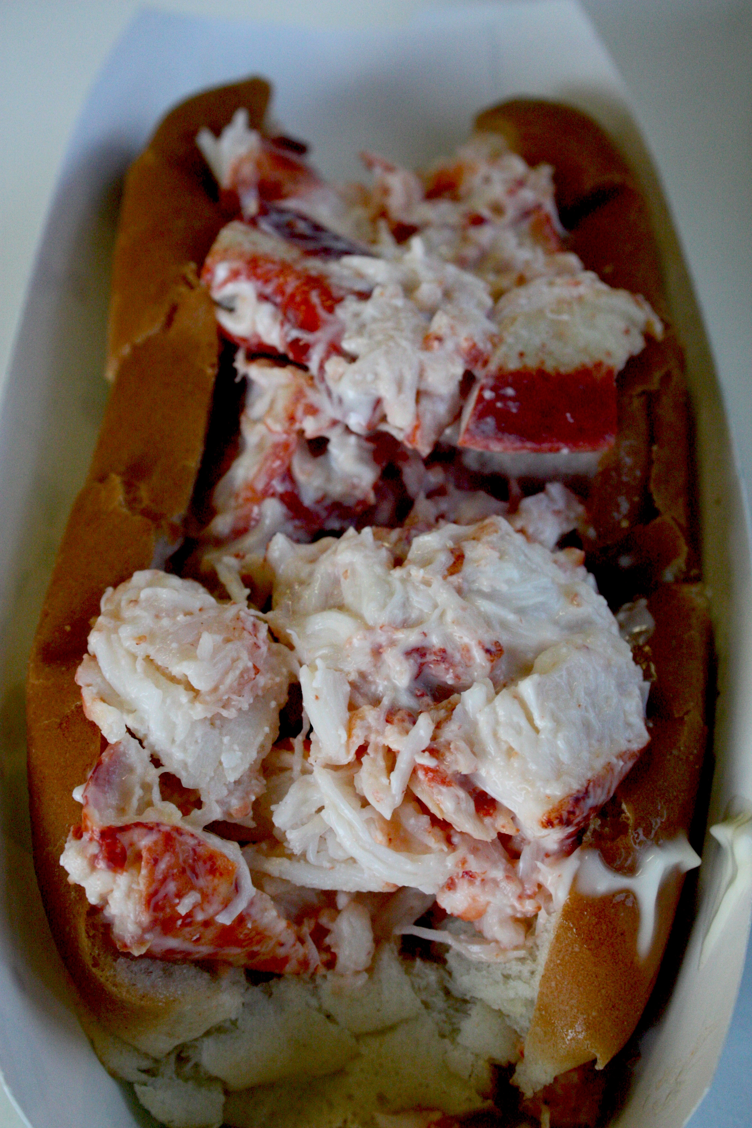 Hearty fresh, slightly stringy, cool chunks of lobster, very little mayo on soft roll. Wonderful.