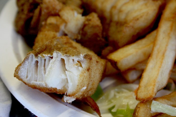 Delicious, tender and flaky, very fresh. The flesh was creamy and snow-white and the fried coating thin, crispy, with not an ounce of excess grease. The “chips” portion of the dish not very impressive but the fish stole the show.
