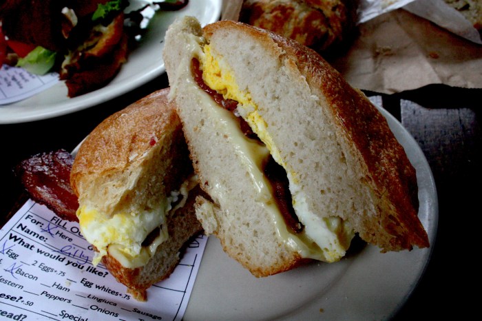 A simple, filling delicious breakfast sandwich. Smokey house-made bacon, fresh egg on a crispy French roll.