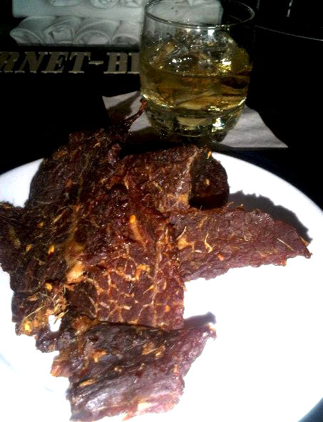 Citizen’s Public House’s house-made Beef Jerky and a glass of Makers Mark on the rox.