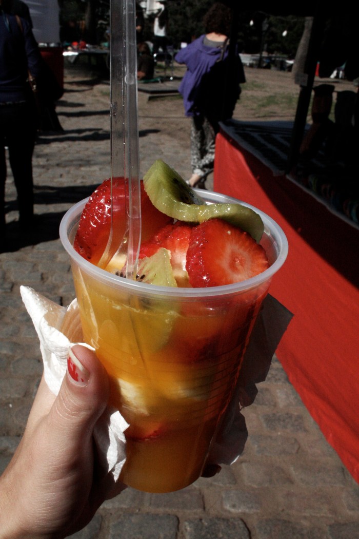 And then there’s the fruit-cup. This is definitely for the less grave of morning-after situations, perfect for when you need something healthy with a sour twang after a night of stuffing your face with greasy asado. It also works as a way to make yourself feel better after eating a sketchy street meat (see above). My favorite fruit-cup vendor in the Recoleta Feria is a flirtatious, plump Argentine man in a gaucho hat who squeezes orange juice with particularly impressive vigor and who, upon reading off my face the indecision between fruit cup and orange juice, suggested mixing the two and creating this vitamin C-filled masterpiece. And he only charged me 4 pesos because, well, to him I am lindissima even when I actually look like death in PJ’s and Uggs.