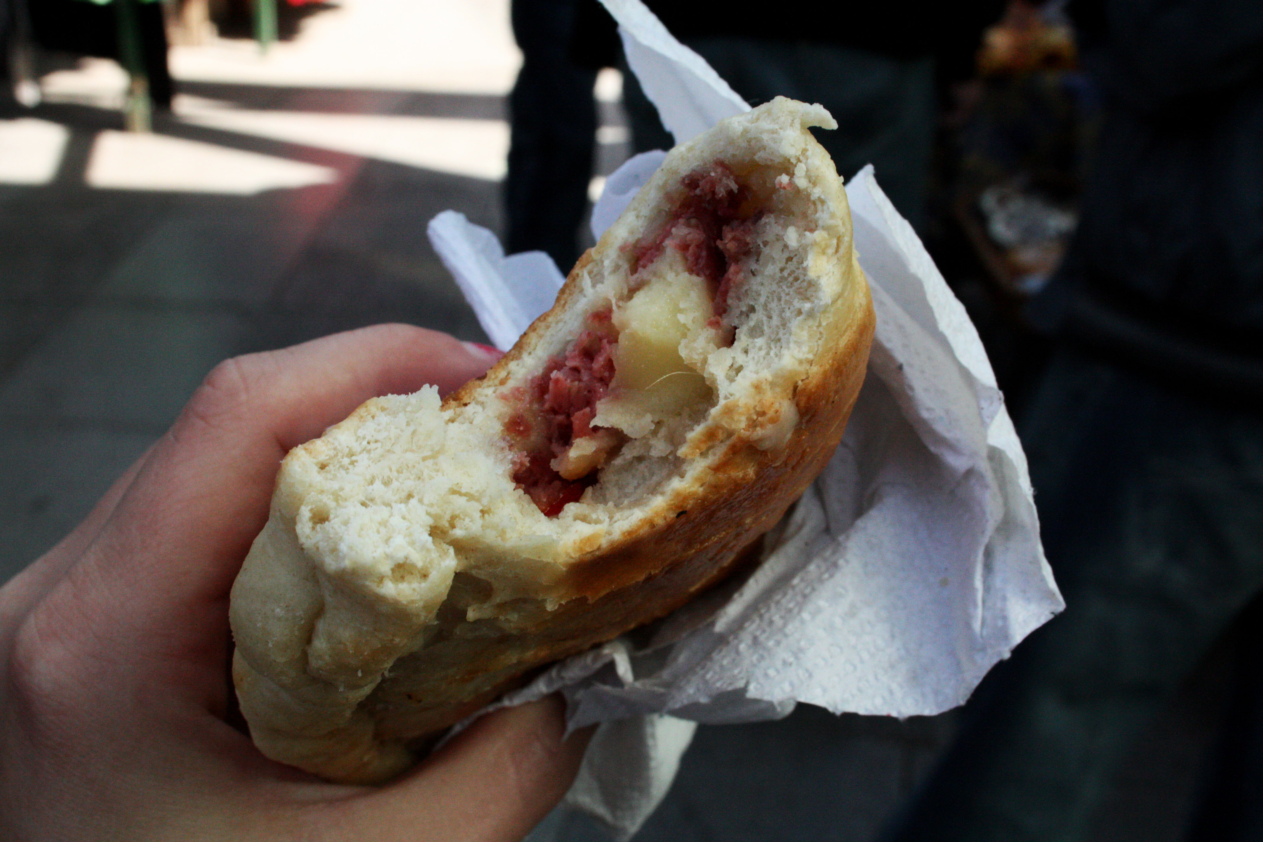 While the skinny sandwiches above are ideal for a morning after when you need a spicy flavor in your mouth to replace the taste of cigarettes and death, wake you up and make you feel human again, the pan relleno (stuffed bread) is definitely the one you need when you wake up at 3:00, physically drained and hungry as hell. A gigantic, hearty round of doughy, soft and (if you’re lucky) warm bread stuffed with a variety of delicious fillings, sometimes ham, sometimes chicken, often tomato or onion, but always a generous amount of gooey, slightly oily cheese. A fistful of comfort and self-stabilization right here.