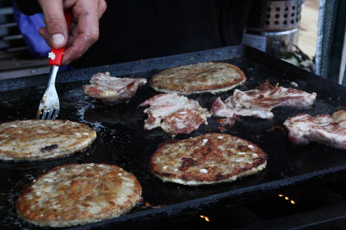 Boy am I glad that I have Eastern European genes and that those genes encode an iron stomach, otherwise I would be deprived of what is definitely one of my favorite source of protein and fat, the king of morning-after gastronomy: the sketchy street meat. Chorripanes, morcillas, lomitos, completos, bondiolas, hamburgesas; you name it, I’ll squirt some chimichurri or pebre (I miss Chile…) on that unidentifiable piece of animal, ask for 4-5 extra napkins and dig right in. Here I opted for the lomito instead of my usual chorripan. A surprisingly not that greasy piece of tender though slightly chewy beef (maybe veal?) handled with a fork but by not very clean hands, grilled on a hot plate until no longer raw (but definitely not FDA approved either), stuck between two slices of toasted bread, left for you to season with a variety of home-made, equally sketchy-looking but phenomenal sauces of different consistencies and flavors. Soaks up everything bad in your body and replaces it with guilty, non-apologetically goodness.