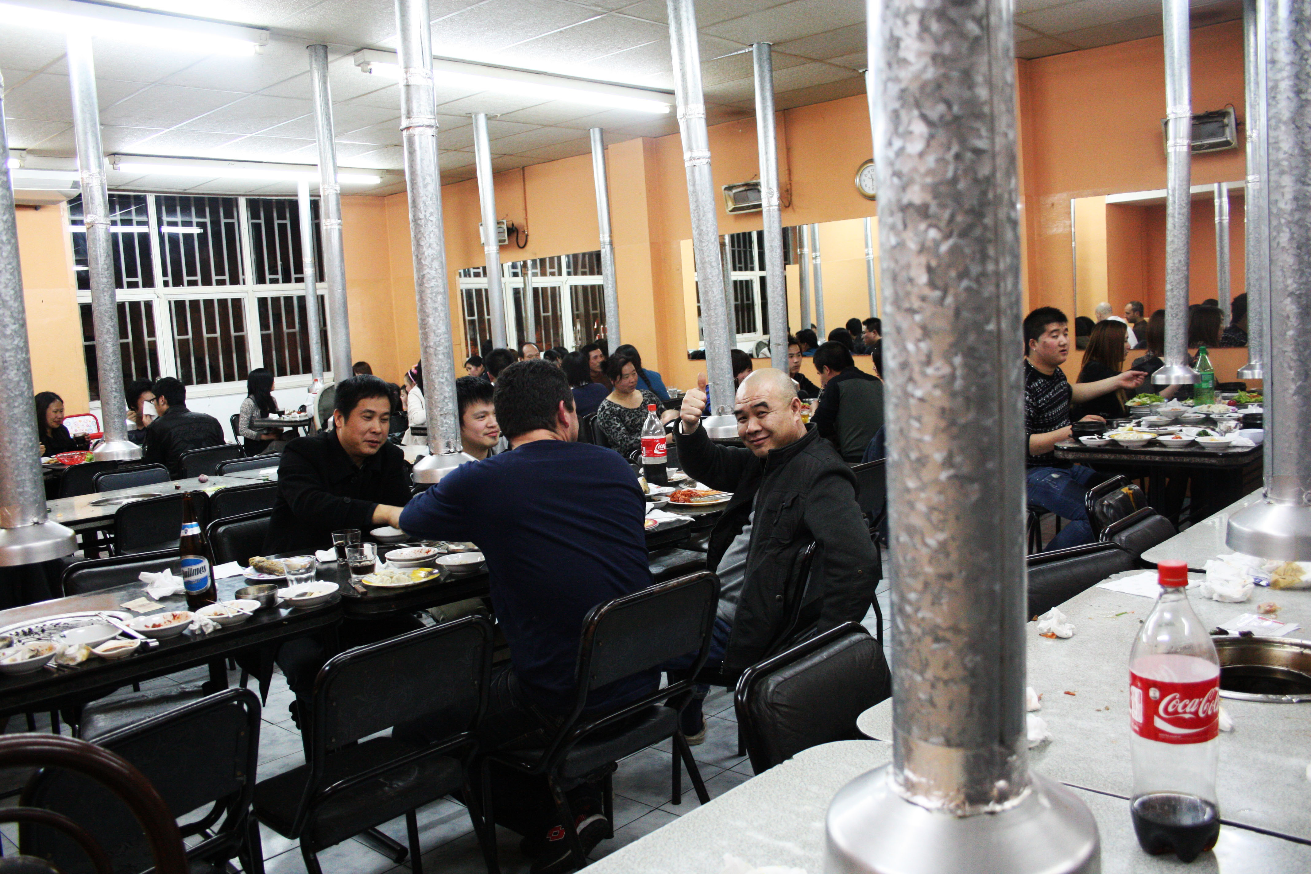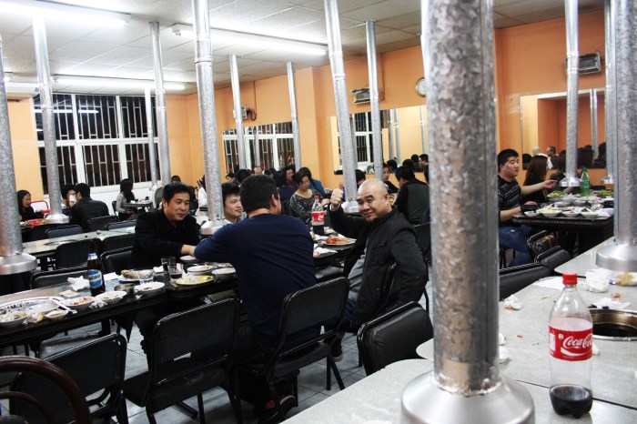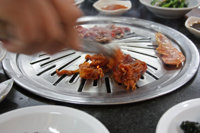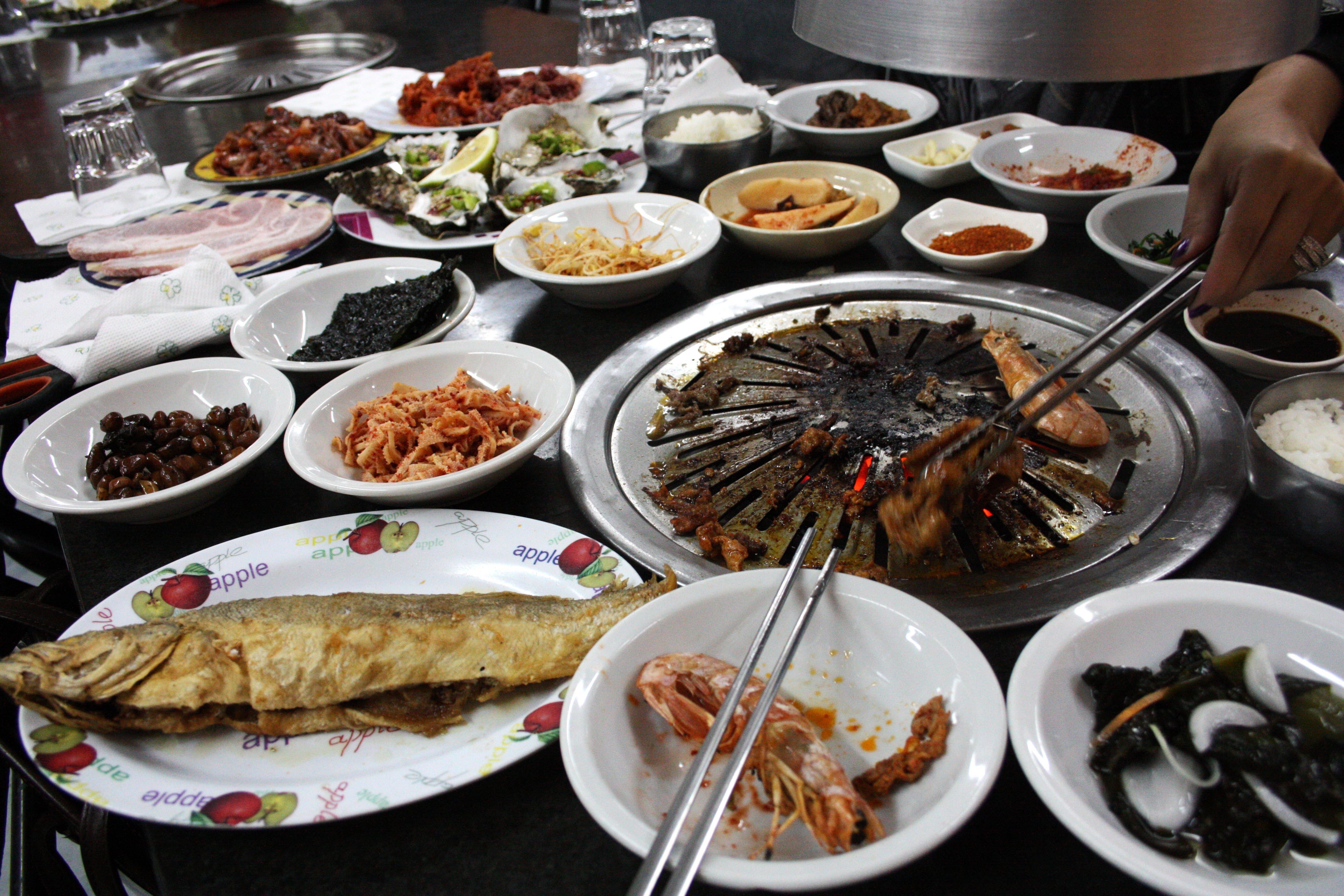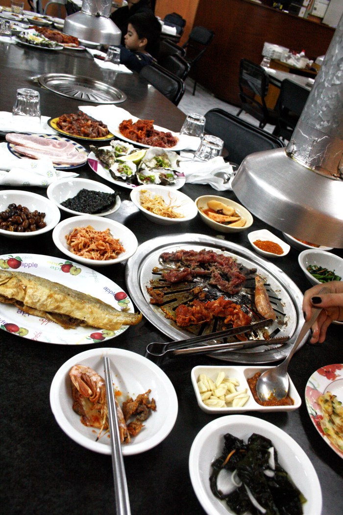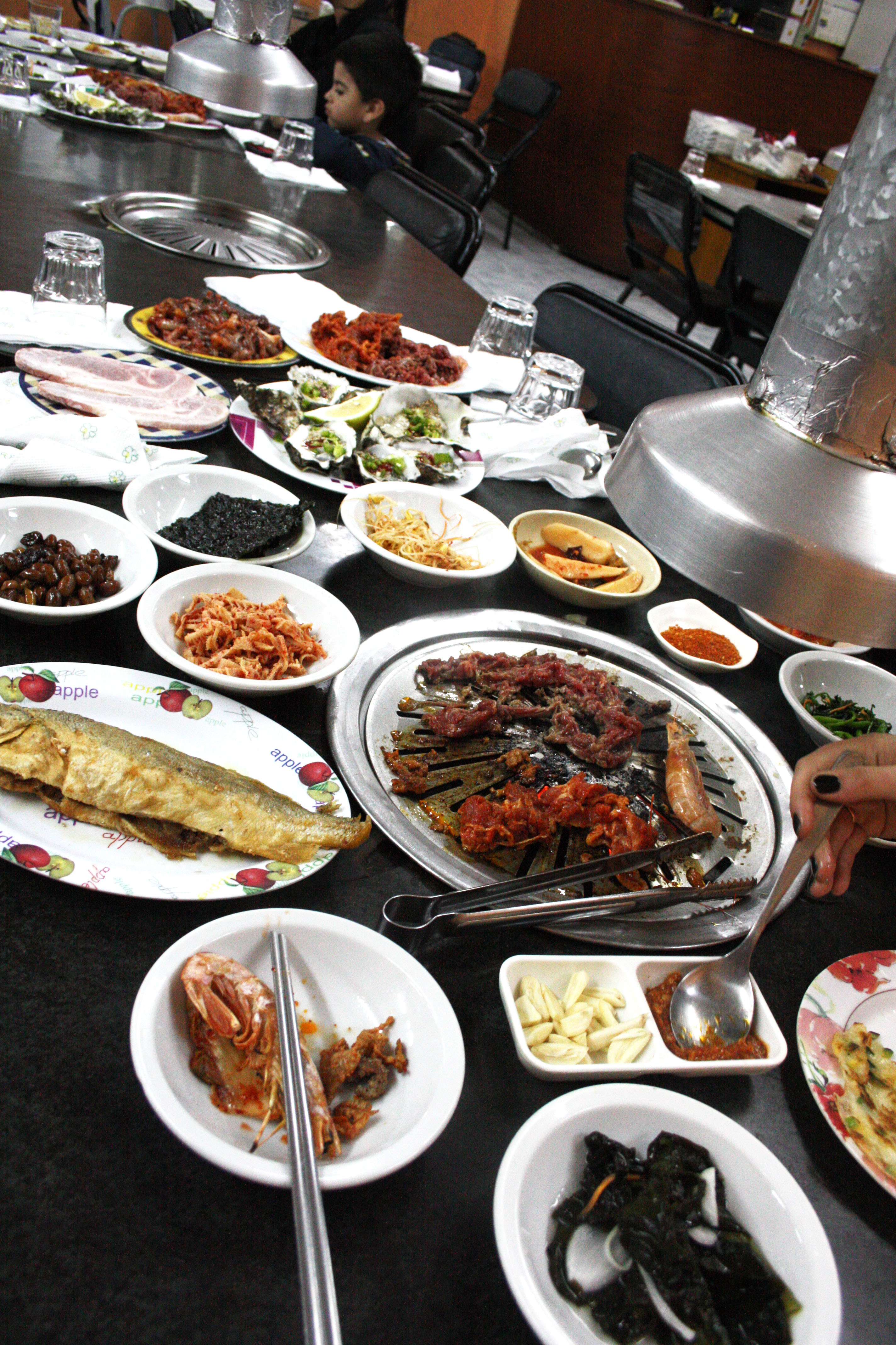 Long, family style tables line the dining room, three metallic ventilators suspended from the ceiling, hovering over each table. An overwhelming number of tiny little plates and bowls, each filled with colorful sides, surrounding a circular, convex, built-in grill. Sizzling sounds and smoke lured us in and we quickly took a seat among big groups of Korean families and friends who were already happily wolfing down their grilled meat and kimchi, chewing and chattering noisily.