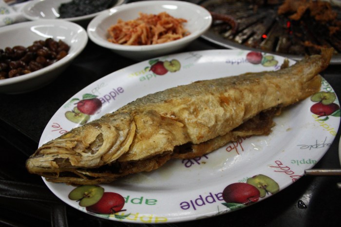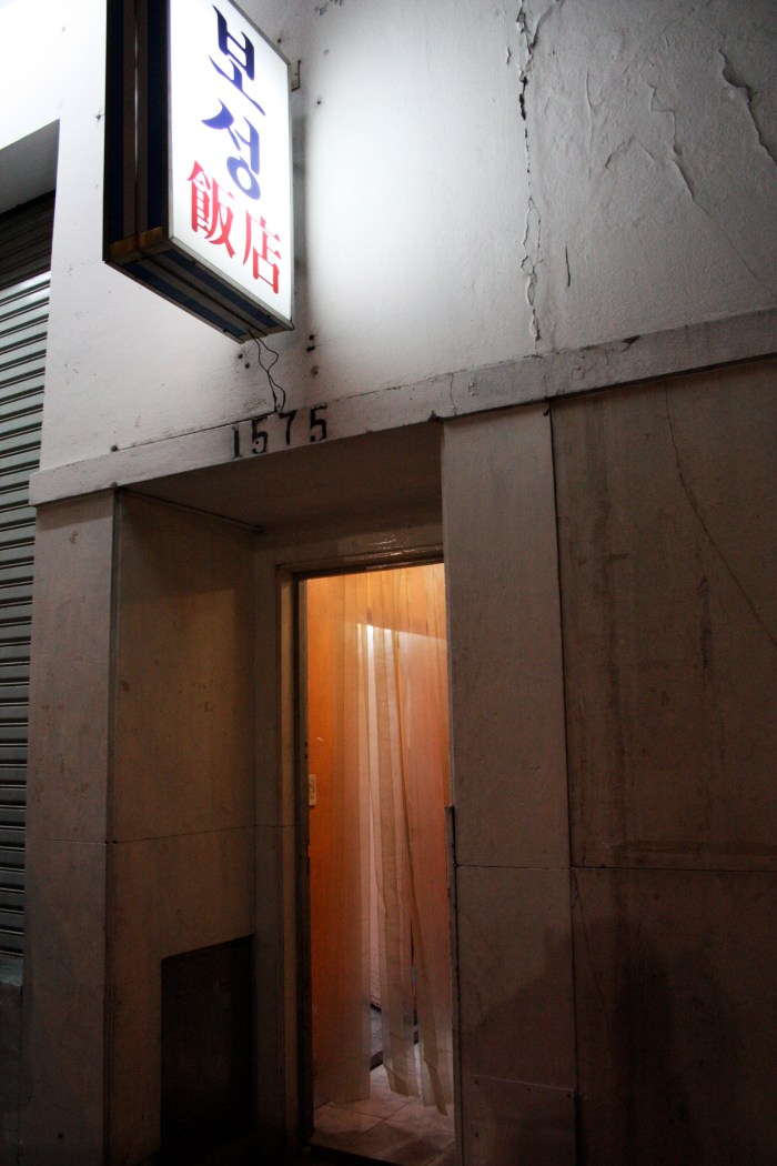 The one some adventurous friends and I chose was an unassuming little hole-in-the-wall named Bo-Sung-Restaurant, a place with a narrow entrance, a slightly off-putting plastic strip door and nothing but a neon sign with 4 Korean characters marking it as a place of serious eats. A bit weary of visiting a neighborhood with not the best reputation (when it comes to safety) after dark, we took a cab and judging by the number of bullet-proof-vested police officers roaming around the area, this was probably a good idea on retrospect. A bit tough to get to, yes, but the food… Well let’s just say it’s worth a visit back really soon.