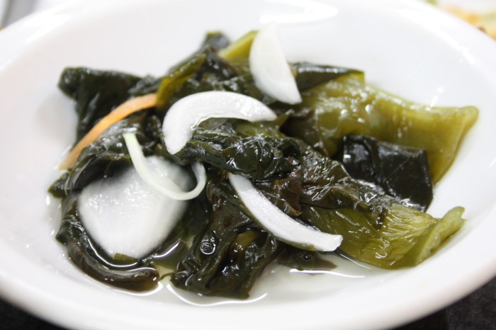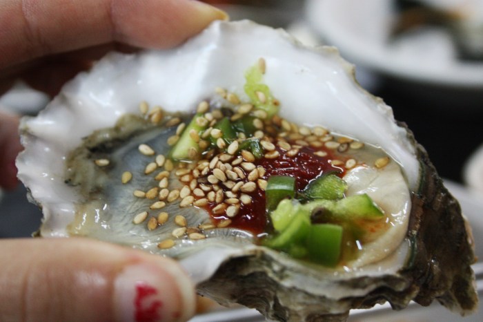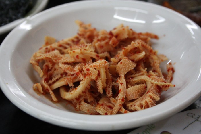 And then, when the meat had been laid down, it started. An onrush of the little plates containing the banchan (side-dishes): kimchi (the pickled, spicy cabbage, so sacred in Korean cuisine), soft and slimy marinated seaweed with onions, brittle dry crispy seaweed, scallion pancakes, wonderfully flavorful steamed pork mini-dumplings with soy sauce, fresh, crisp bean sprouts in vinegar, peanuts saked in soy, crunchy shrimp with the head still on, tender pickled parsnips, chewy strips of tripe with red pepper flakes, a deliciously flaky whole roasted fish (the species of which the waiter could not identify), bowls of sticky rice, very extravagantly seasoned and surprisingly good quality (and huge!!) raw oysters, something called “pancetta” which seemed more like pork loin, octopus tentacles, a steaming bowl of miso soup with soft tofu and a host of spicy sauces and dry herbs to flavor all of it with. And in the middle of it all, tender and perfectly marinated strips of beef, pork and spicy pork sizzling away on the grill.