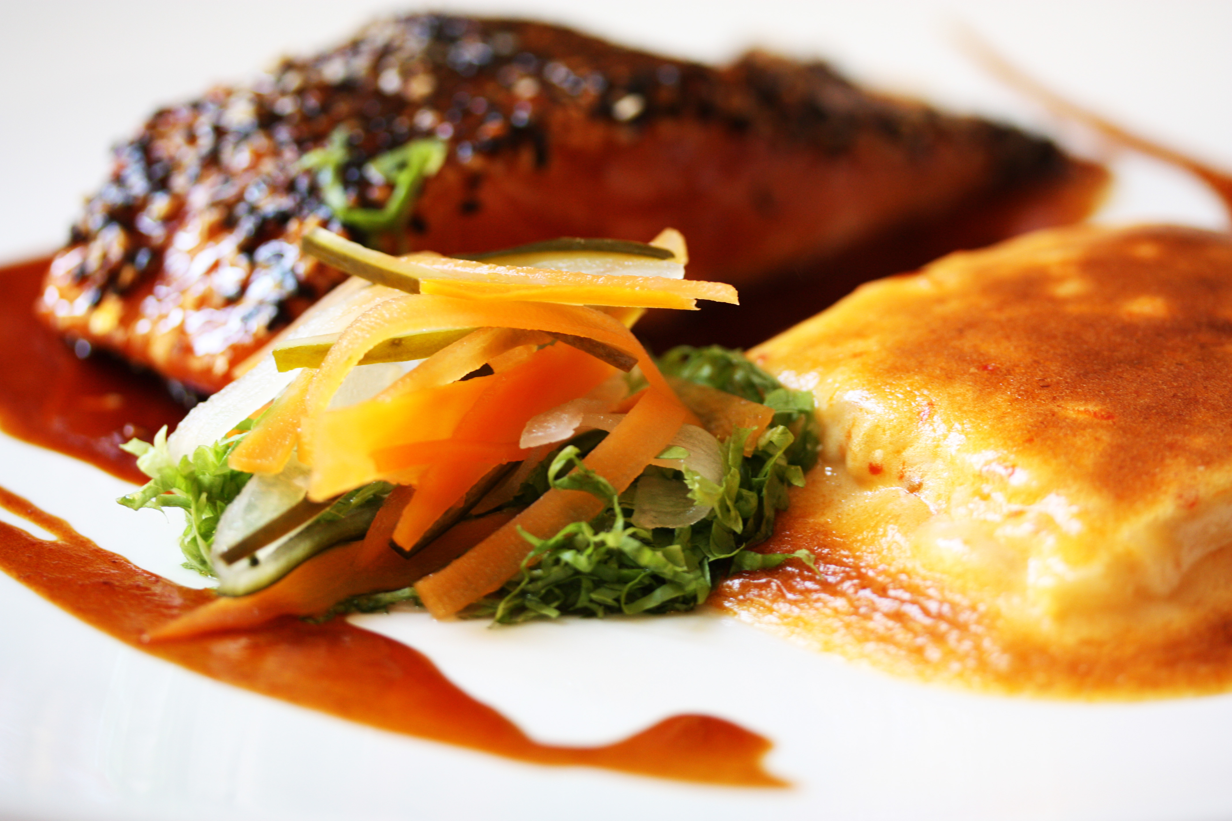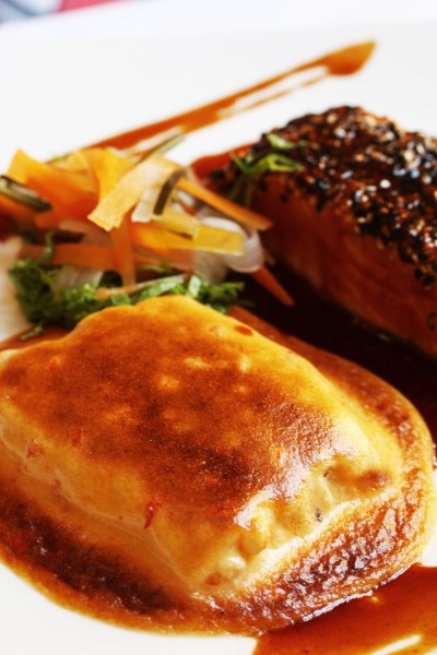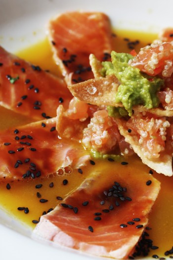Thin slices of perfectly fatty, slippery tuna immersed in a sweet, slightly tart and VERY yellow (visually striking) maracuya purée, drizzled with a bit of soy and dotted with black sesame seeds. In the middle of the plate, a little tower of deep-fried, crispy tortilla chip triangles, layered with delicate little chunks of salmon mixed with creamy guacamole and a bit of quinoa, sprinkled with ribbons of scallion. I loved the idea of showcasing the raw salmon by juxtaposing two popular preparations of it (simple sashimi style and traditional French chopped-up-and-mixed-with-stuff style) in a single plate. The fried chips added a firm body to contrast with the buttery soft salmon and a bit of much needed oily-crunchy sinfulness to an otherwise ultra-healthy and light dish. The guacamole was packed with citrusy flavor and harmonized with the salmon and the sauce very nicely, while the quinoa grains clinging to the stuff added a playful, slightly chewy, bubbly texture. My only qualm-ito with this dish was that the sauce was too much and a bit too sweet, robbing the salmon of some of its super-subtle natural sweetness. The spots of soy sauce woke it up a bit though, so it was ok…