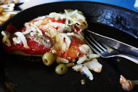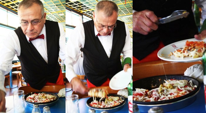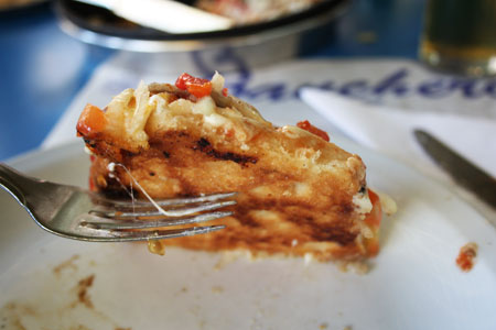 A bit lost in the 4-page pizza menu, I decided to order the Banchero (with morrones, love those), figuring it was the house special. I could hardly control my salivating as our waiter quartered and served the thing with super-swift motions out of the iron skillet it was baked in and onto the crisp white, labeled plates.