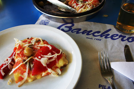 Speaking of awesome pizza places in BsAs, family-owned and proudly historic El Banchero definitely makes the list. A seriously spacious cafeteria on the corner of dusty, deserted Admiral Brown and Suarez which no doubt fills up (or, at least, USED to fill up, in its glory days) with roaring-drunk and joyous Boca Junior fans of all generations and backgrounds looking for a bite to soak up all that pre-, mid- and post-game Boca-sponsoring Quilmes or Pepsi, to celebrate yet another victory. As I caught El Banchero on a quieter day, these voices were converted into echos, making the place almost eery in a way, but in a cool way. Vivacious, penguin-suited waiters chased the tumble-weeds away and there were enough costumers to make the place seem habited, though far from packed.