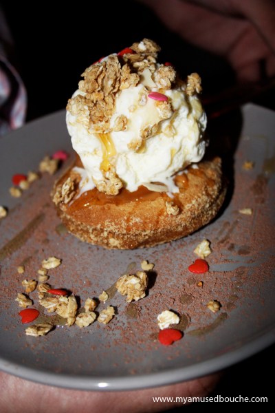 My second dessert choice also had much to do with nomenclature (clever way to raise curiosity among customers, I’ll say), something called pkjor cannot go unordered. A breaded and fried cake (or was it a brownie?) topped with a giant scoop of smooth vanilla ice cream, drizzled with honey and sprinkled with bits of granola, coconut and tiny little candy hearts. Dusted with cocoa powder. Tasted as good as it looked.