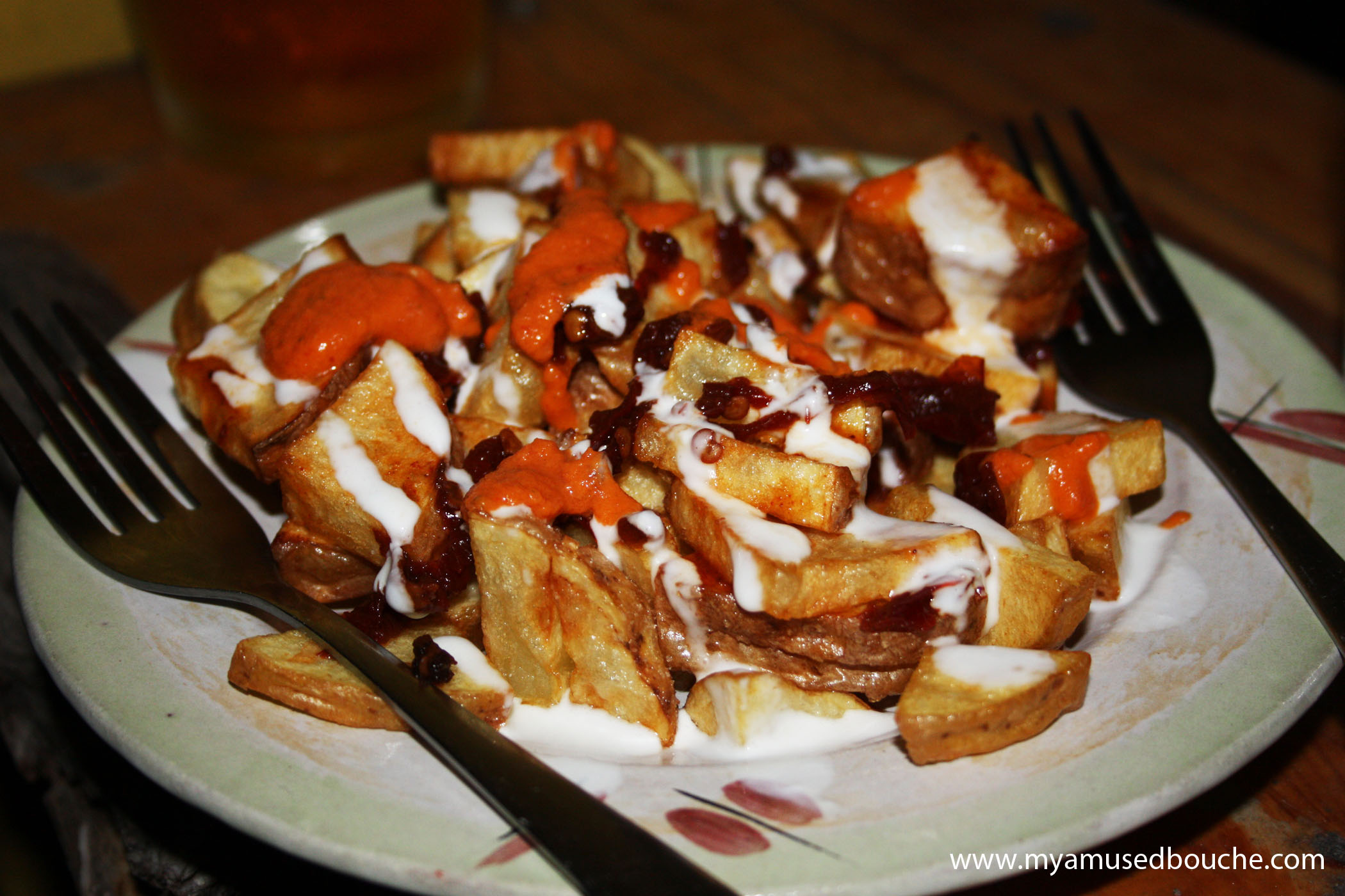 Papas bravas were another great dish to share. Irregular, bite-size chunks of white potato boiled and fried in oil until crispy gold, drizzled with what I recall was a garlicky, slightly citrusy mayonnaise-based aioli (“no spicy”) and a very flavorful vinegary red pepper sauce ([kind of] “spicy”).