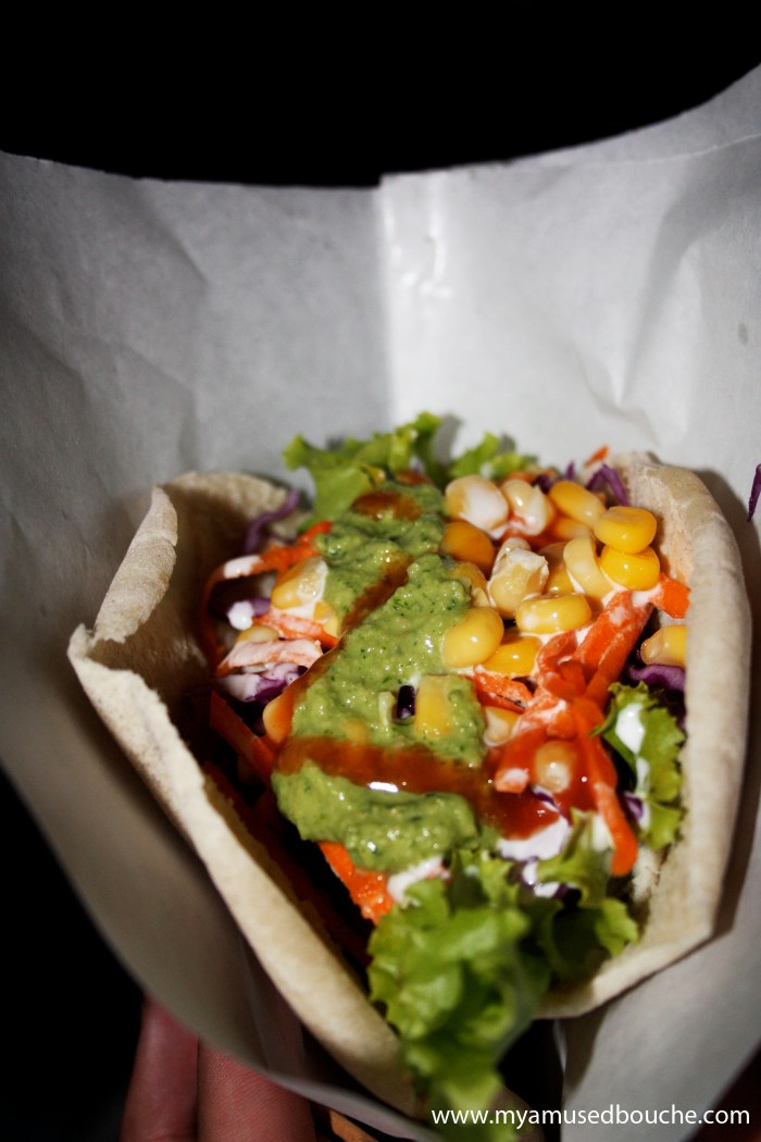 And there are a LOT to choose from: fresh crunchy cucumber and radish slices, grilled zucchini and eggplant, shredded carrots, plump corn, crispy purple cabbage and baked cauliflower, black beans, chick peas, sauteed green beans, chunks of avocado, jalapeno rings and pickled peperoncini. Salsas verde and rojo, more of that garlicky white aioli, thick roasted pepper spread. As I saturated my pita with many spoonfulls of all this good stuff, not-so-sneakily filling not just the sandwich itself but also the basket around it, the lady working gave me not the slightest look or word of judgement but a smile instead. Biting into my customized pocket, and experiencing on my tongue the rendezvous between the oily, comforting, nutty, warm falafel and all those refreshingly cold and crisp veggies…well, it was pretty alright. Don’t share one of these, that’s just stupid.