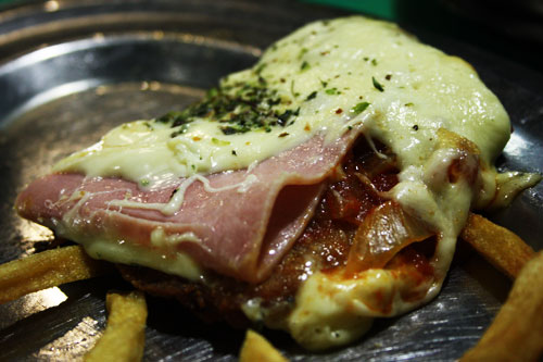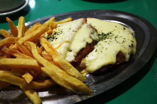 I have to say, this milanesa (a la) napolitana actually crossed “tolerable” with flying colors and came just short of the “amazing” line. The beef, far from the greasy thick cow chunk I’m used to in this dish, was incredibly tender, perfectly pounded, beautiful baby veal no thicker than a 70-sheet College Ruled notebook. The tomato sauce was thick and wonderfully flavorful, with chunks of onion and tomato poking out here and there while the more acidic, liquidy part of the sauce greedily invaded the dried bread crumb coating of the meat. A salty-sweet, slightly chewy but mostly soft piggy blanket of ham was lain over the top of the sauce and a layer of gooey, oregano dusted faux-mozzarella (let’s just call it provolone) melted over that. In this case, although the cheese was thick and satisfying, it was not overwhelming and while the ham was packed with flavor, there was only a single thin layer of it so it danced gracefully with the veal like a young beautiful lovers instead of lying on each other fat and lazy like some sort of old, disgruntled married couple. The acidity of the tomato sauce cut the excess oil from the cheese, everything was perfectly balanced. Handcut, crispy gold fried were bomb too. It left me light as a frikin’ butterfly.