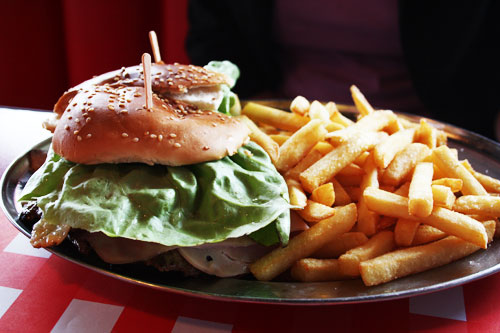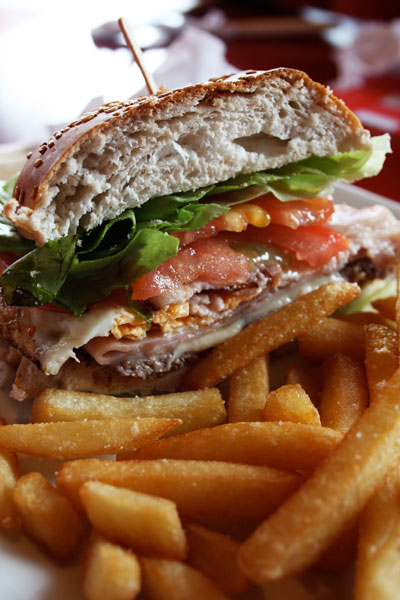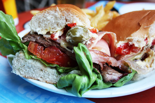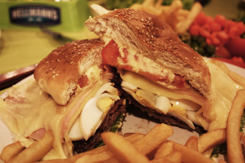 This one popped my chivito cherry and oh did it feel nice. The beef had a delicious grilled flavor and was tender. Velvety, still warm mozzarella oozed out, sticking ribbons of salty Canadian bacon to the churrasco, uniting beef and pork in a frenzied embrace. Crunchy cool lettuce and juicy, thick tomato wedges broke up the romance a bit, adding a fresh lightness as a much-appreciated contrast. Gigantic, plump green olives popped out of the mayo here and there to say hello and add a tart tone. The bread could’ve been toasted a TAD more and there could’ve been a BIT less mayo but this is Uruguay’s national sandwich, not San Fransisco’s. When in Rome… shut the hell up about the mayo and eat your goddamn chivito.