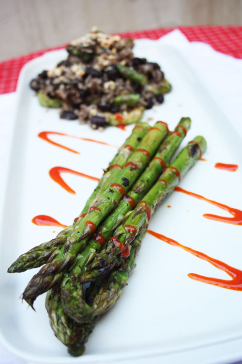 This is her veggie chili fried rice. Black beans and rice mixed up with grilled rounds of zucchini, topped with toasted almond slivers and served with a few grilled logs of fresh green asparagus. Drizzled with a bright orange chili sauce.