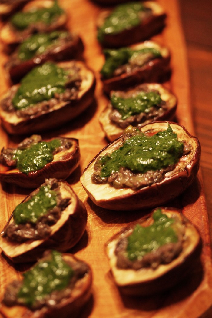 I FREAKIN’ love eggplants. Always have, always will. In every form. I was therefore pretty excited when she made these for me one night – grilled baby eggplant with the insides scooped out, mixed up with some spicy stuff, onions and garlic and stuffed back inside, topped off with a bit of cool, slightly citric basil chimichurri. They came out beautiful, conveniently bite-size and delicious.