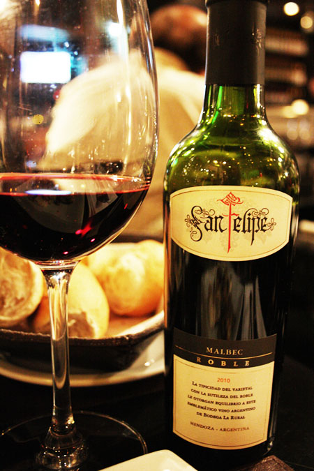 It was the first seriously cold night I’ve gone out in pretty much since December in Boston so I didn’t hesitate to order a red, in this case a San Felipe Malbec 2010 which, considering it was $38 pesos for a 350 cc bottle, was hideously overpriced. Nevertheless, it hit the spot and warmed me up, not to mention the fact that it went perfectly with the earthy little snack I ordered, the Bruschetta ai Funghi. The latter consisted of two crispy spears of grilled focaccia crossing each other elegantly on the plate, topped with a generous amount of warm, tender button mushrooms sauteed in good olive oil with plenty of dried herbs, cracked black pepper and garlic. Again, a bit overpriced for the size and for the fact that there was only one type of mushroom in the topping (I was expecting some kind of forest mushroom blend), but it was perfectly prepared and exactly what I wanted in the moment.