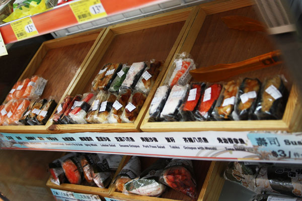 Walk into any 711 at any time of the day/night in Hong Kong and you will find a refrigerated shelf packed with a grand variety of bite-sized sushi, wrapped in plastic, sold at $3 HK (so about US$ 0.40 a pop). The choices are innumerable and even change sometimes, making it difficult to keep up – there’s crab salad, lobster salad, crab stick, salon, tuna, eel, octopus, scallop, shrimp, fish roe, seaweed and undoubtedly many more which I’m forgetting. On the walk back from the beach, when I need just a bite of something put together and interesting, I just get one or two of these and eat them on the way. Sure, they are probably not the BEST quality seafood you can find in a Pacific Coast city but they haven’t caused any digestive problems so far and they’ve mostly all been pretty good. Plus having “sushi – octopus” and “Slurpee – blue raspberry” on the same receipt makes me smile for some reason.