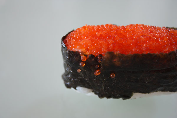 This one is my fave, fish roe. Briny little bubbles of sea-water, basically, in the form of orange fish eggs. A thick layer of them packed on top of a shelf on sticky white rice which is wrapped inlayering layer of dry but sticky in the mouth seaweed and chilled. The eggs burst like mini bubble wrap when bit down upon, one of my favorite textures.
