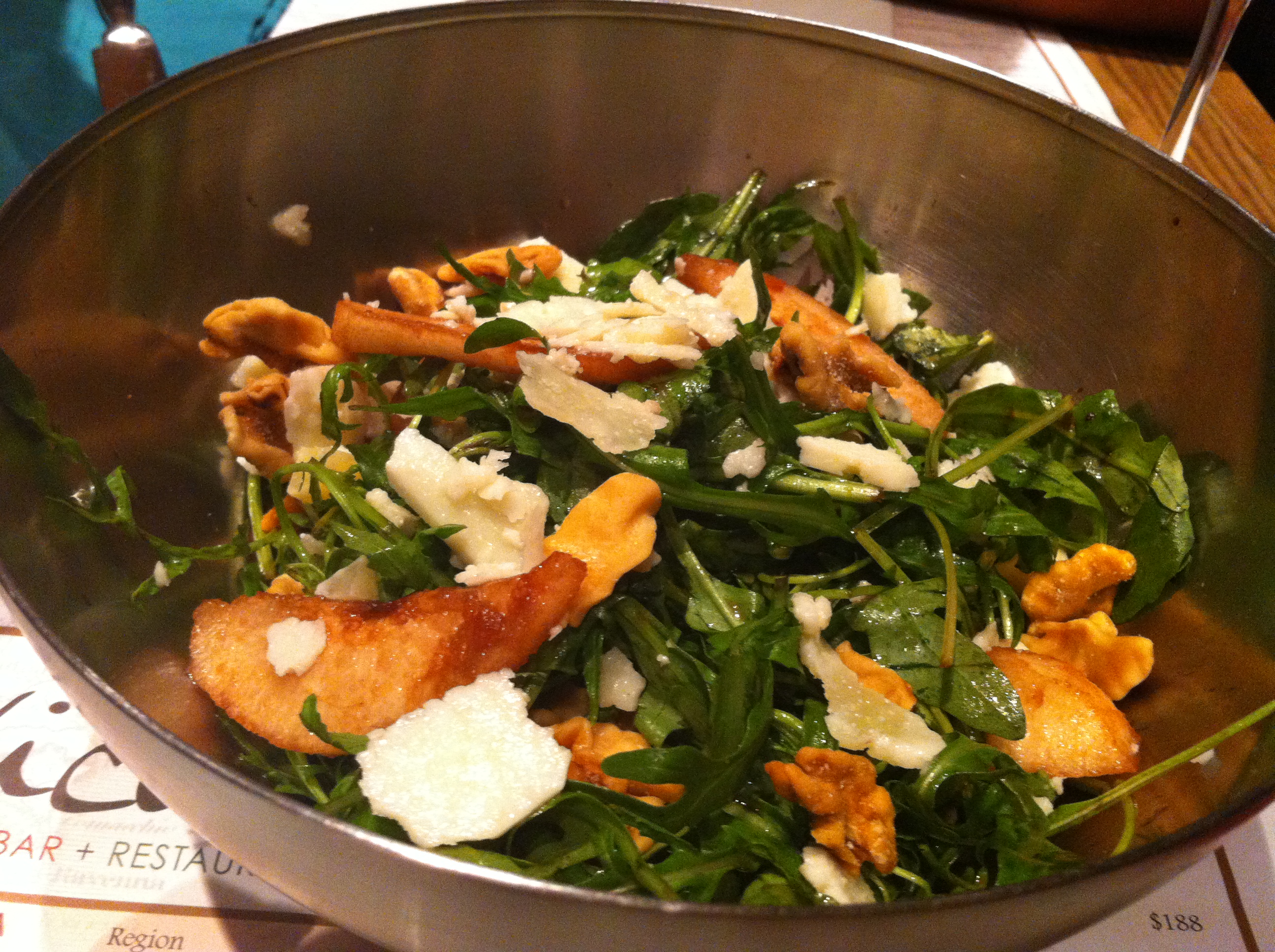 As heavy pasta or roasted lamb are not really my thang when it’s 92 F out, with 80% humidity (at 9:00 pm!), I opted for two of the more lighter dishes, the first of which was a salad of arugula with slices of grilled pear, pecorino cheese and toasted walnuts, drizzled in a very light, not too oily vinaigrette. I very much enjoyed this dish. It was refreshing, with no heavy ingredients to weight it down, but still interesting as the sharpness of the pecorino harmonized wonderfully with the smokey, nutty oils of the walnut and the juicy sweet twang from the pear.