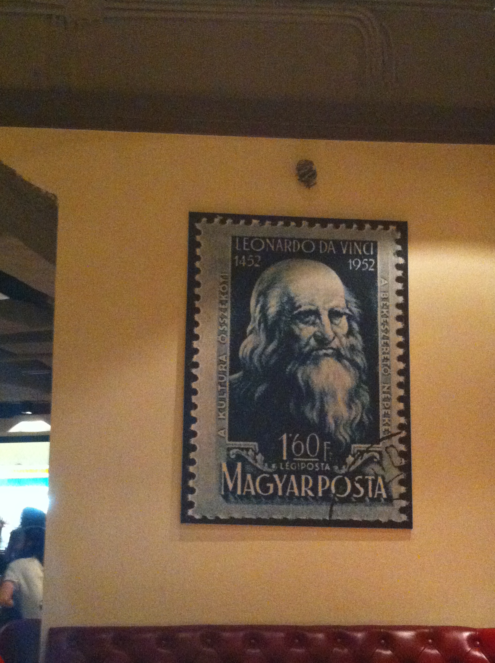 Besides the very friendly waitress who helped us select a bottle of white which went perfectly with our two little dishes, an added and very much welcomed surprise was this framed poster of an enlarged Hungarian stamp with the face of Leonardo DaVinci pictured on it. The label “Magyarposta” (“Hungarian post”) made me feel a bit nostalgic and quite at home, while the quote “A bekeszereto nepeket a kultura osszekoti” (“Peace-loving nations are joined by culture”) made for a nice conversation started with my dinner friend.