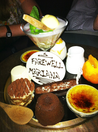 Lastly, and I’m glad I saved space for this one, the Aqua dessert platter. Creamy soft signature tiramisu, molten chocolate fondant cake (deep, dark, thick chocolate ganache oozing out of a soft chocolate cake), caramel creme brulee with a crunchy sugar lattice top, tangy tangerine and lemon sorbets, some sort of boat with dollops of chocolate butter creme piped inside, a martini glass filled with champagne ice cream, yuzu jelly, champagne jelly and drenched in bubbly champagne. My favorite? The green tea creme brulee – same texture as the caramel one but with a green tea infused custard on the inside which was wonderful, with a perfect balance of fresh, vegetal green tea flavor and creamy sweetness.