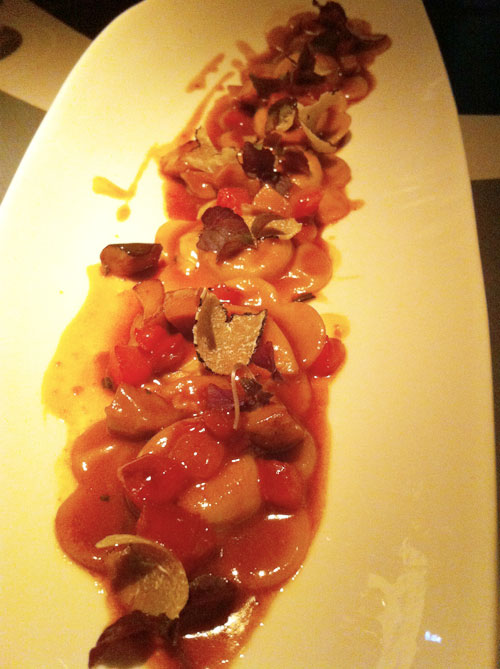 Our amuse bouche? Fatty, salty, paper-thin sheets of perfectly marbled Parma ham rolled up and pinned to a wedge of brown bread, moist inside and rustic-crunchy on the outside. The Italian side of things. The Japanese side of the kitchen was represented by bits of roasted but still quite cool lobster meat served in a flower-bed of fresh, crunchy cucumber.